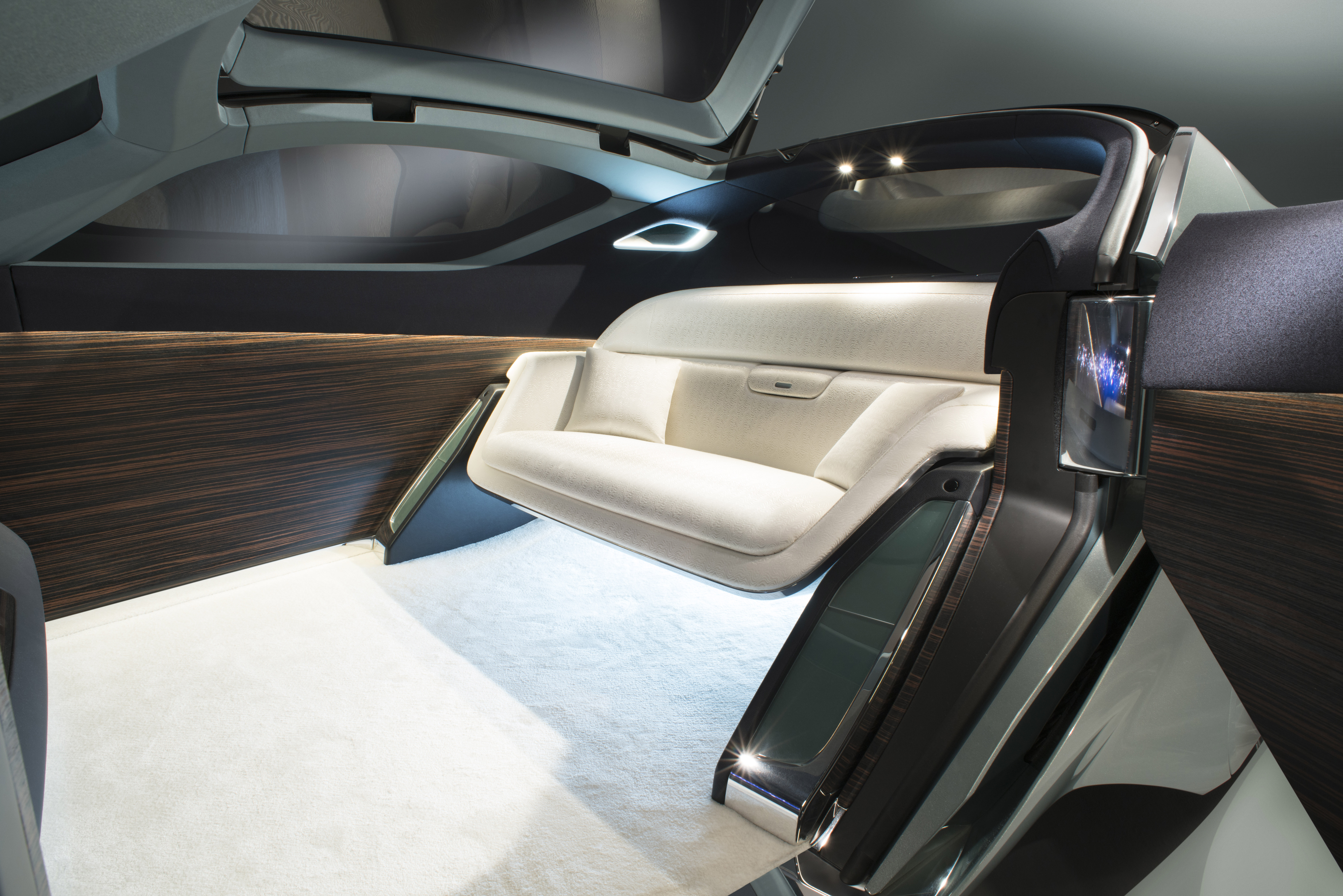 At first look, the design is polarizing to say the least. But it’s not supposed to garner a reaction like, “oh, that’s cool, I like it.” It’s supposed to make you question what you think a car should be and what it should look like. The ride offers a shape that completely caters to one single rear bench seat. With the oncoming of intelligent autonomous vehicles, there’s no reason to have a real “front seat” section, and the 103EX reflects that. The door panel and roof opens up to invite you into what RR wants us to refer to as your “sanctuary.” Within, you’ll be able to calmly eat Fruity Pebbles, or try a new sex position, or go through business expenses, or whatever it is you like to do with your free time in your car.