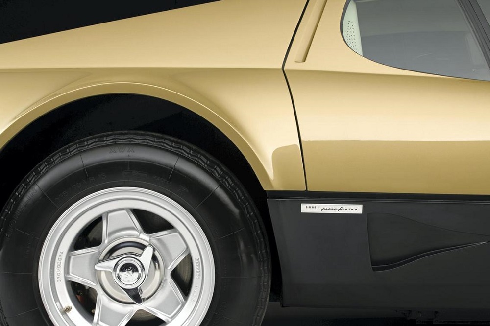 The 1977 Ferrari was one of a kind, painted in Oro Chiaro Metallizzato, or light gold metallic, with Testa di Moro brown interior. Introduced in 1976 the 512 BB offered a wider rear track, wider tires, updated chin spoiler, and redesigned twin tail lights.