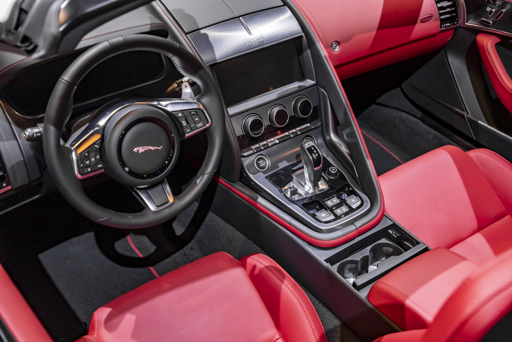 Mars leather seats with Flame Red stitching were picked for the show car, and we have to say the result is amazing. Couple that with the Ebony suede-cloth surround for the gauges, and various aluminum trim pieces make for a modernized and exclusive, but familiar F-type interior.