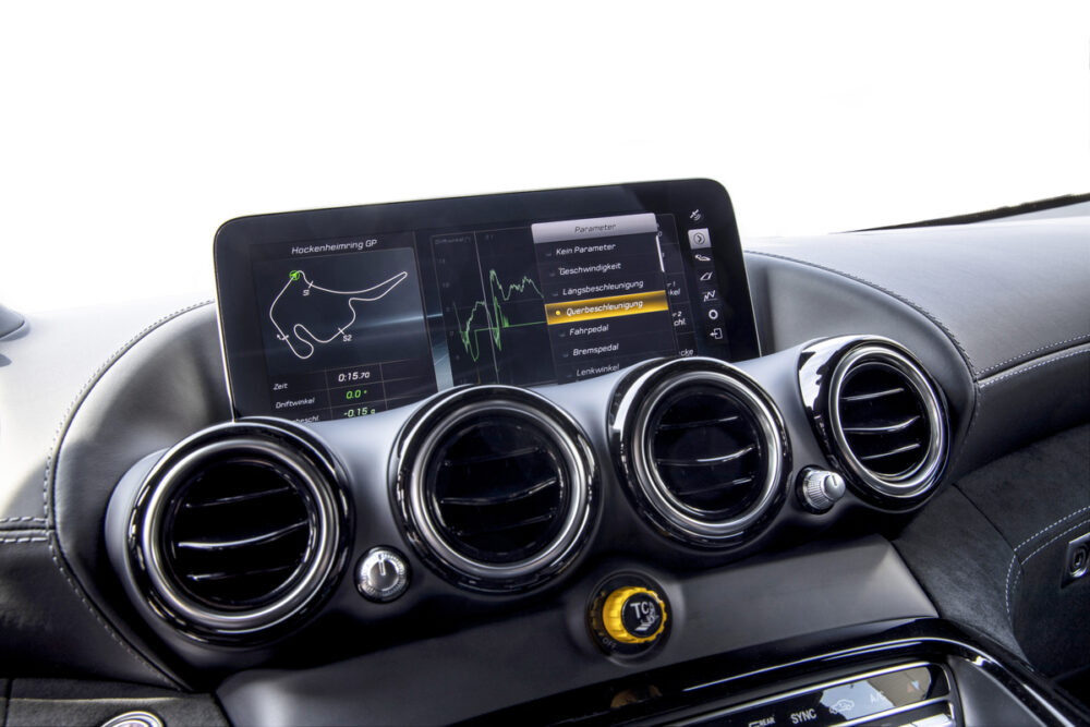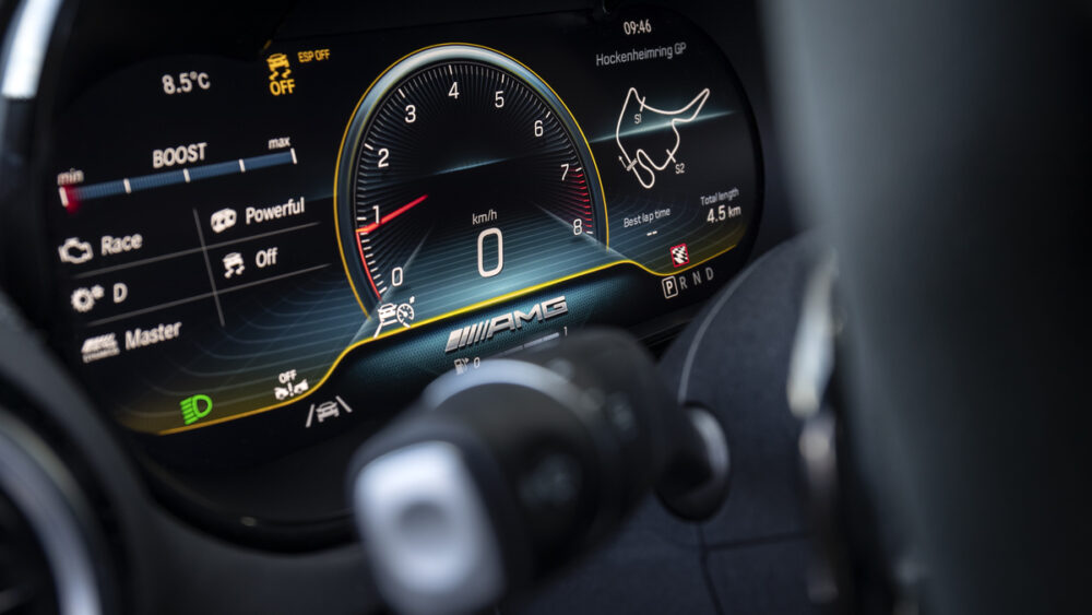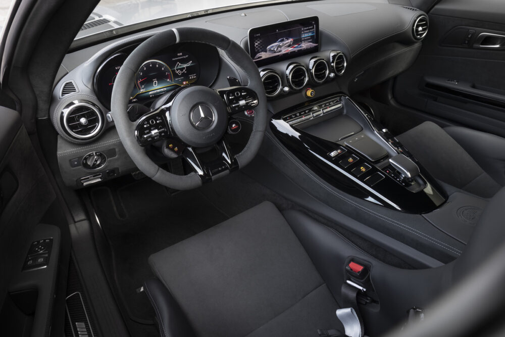The inside of the GT R Pro is that of the upgraded interior for the 2020 AMG GT lineup. The 10.25-inch touchscreen comes with standard Apple CarPlay and Android Auto, the 12.3-inch dial cluster helps enhance the driving experience, and the AMG Performance steering wheel keeps you connected to both the road and the car.