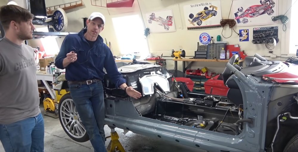 The video begin with Putsch and Hickson taking a look at the elongated Porsche chassis. The previous video ended with the first pieces of chassis extensions being welded into place. When this video begins, all of those items have been welded into place, all of that new metal has been painted to protect against corrosion and the windshield has been removed. In removing the windshield and the a-pillars, they uncovered a section of thick metal tubing that was retained, and which will serve as a connecting point for the custom roof cage of the Lykan.