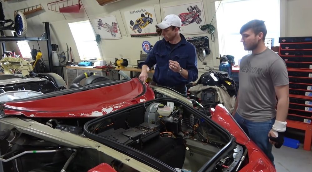 Next, the two move to the front of the car, where they show us how well the dash extension fits on the Porsche chassis. The Lykan windshield extends out much further than the Boxster, so there is a painted panel between the base of the glass and the dashboard. Since the Lykan was based on a Porsche, that panel fits perfectly against the Boxster dash assembly.