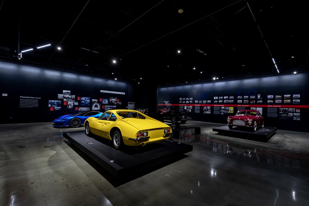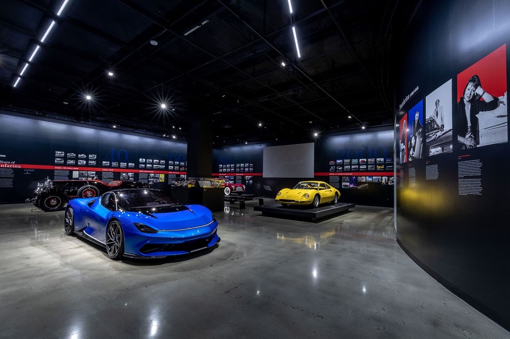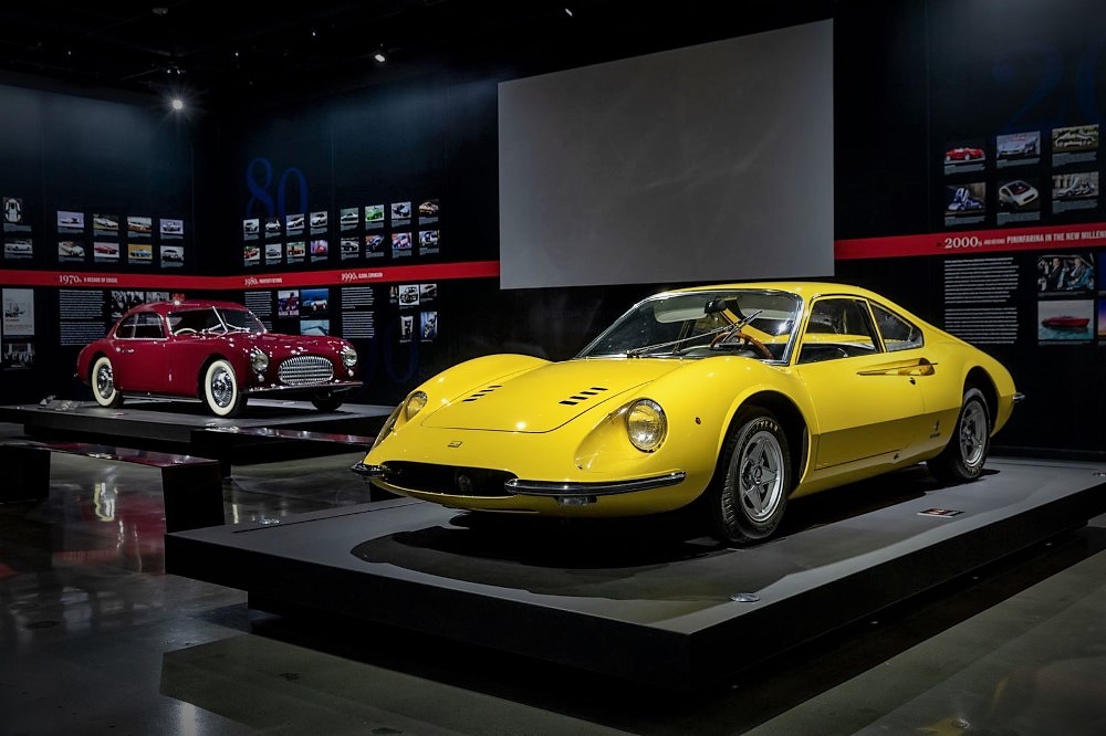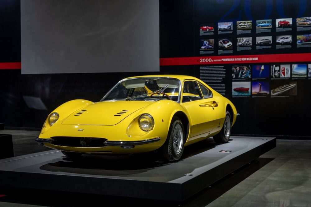 Vehicles on display include a 1931 Cadillac Model 452A Boattail Roadster, the first Pininfarina body mounted on a non-Italian chassis; a 1947 Cisitalia 202 Coupe, widely considered one of the most attractive vehicles ever built; a 1966 Dino Berlinetta 206 GT Prototype, the first mid-engine Ferrari; and a 2019 Automobili Pininfarina “Battista,” which is an early design model of the luxury hypercar. A 1967 Ferrari 365P Berlinetta Speciale “Tre Posti,” the last vehicle bodied by Pininfarina for a private client, will replace the 1966 Dino Berlinetta 206 GT Prototype in April 2021.