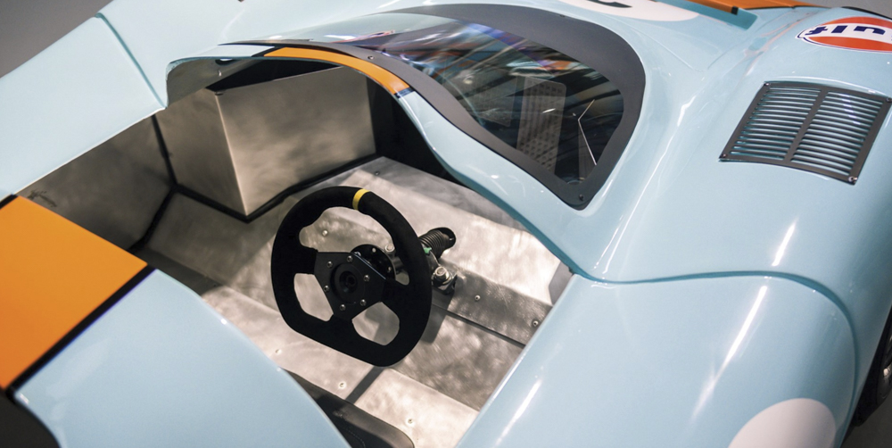 Take a closer look at this 917 and you’ll notice there’s a few neat features. It has just a single center seat, two simple pedals and just a small number of switches inside. In fact, the driver is surrounded by hand-crafted aluminum panels. A rack and pinion steering system greets the driver, and under the engine cover lies a modest 350 cc Yamaha motor. It won’t be setting record speeds on the Mulsanne Straight, but it will ignite passion in any young enthusiast.