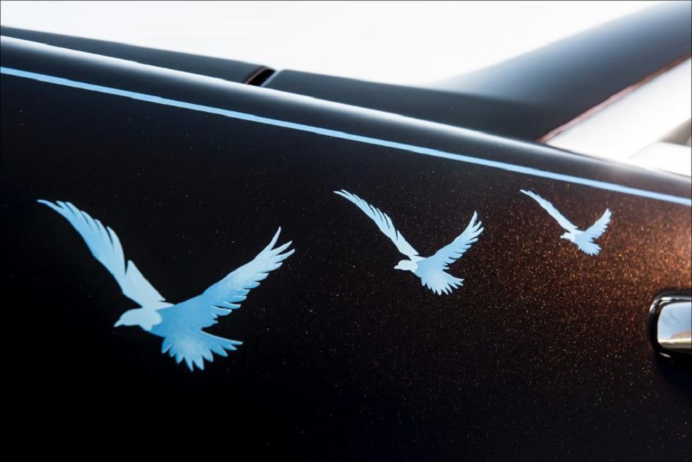 The Who frontman’s second car is a tribute to the band’s timeless rock opera Tommy. The hood of the Wraith features a stunning painting of the album’s geometric cover art. The exterior is finished with several birds in flight, which also come from the Tommy album art. Lyrics from the concept album are engraved on the door flights, and the waterfall is embroidered with a picture of Tommy’s pinball machine.
