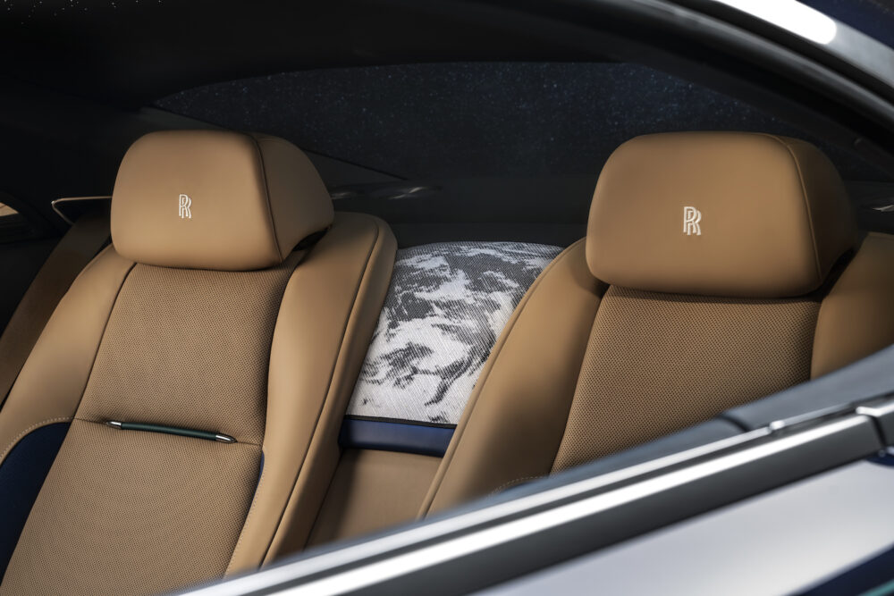 By contrast, the interior aesthetic focuses on the Earth’s surface and the human and natural life that inhabits it. The seats are made from Moccasin leather to mimic the sands of the deserts; Navy and Cobalto Blue accents are suggestive of rivers and lakes, and Emerald Green piping symbolizes nature in all its forms. Arctic White ‘RR’ monograms and stitching hint at clouds and translucent running water.