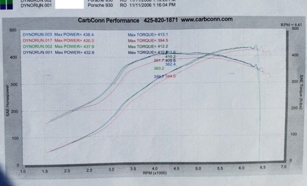 Engine: Complete rebuild using new 98mm Mahle P/Cs to 3.4L @ 7.5:1, big port SC heads fitted with stainless locking Ni-resist rings to prevent head shuffling under boost, 964 spec cams, Aase springs and titanium retainers, ARP. Twin plug MSD CD ignition w/Magnecor wires. Custom fuel head by Imagine Auto Porsche builders with RPM specific solenoid to hold off full boost enrichment and manage A/R ratio. B&B stainless headers, new K27HF S turbocharger, long neck Ruf intercooler, optimized airflow meter w/custom motorsports design intake plumbing. No air injection, cold start plumbing or pop-off manifold. New fuel pumps F/R. Fully shrouded and ventilated oil coolers in both fenders and front valance. Torque curve virtually flat across the RPM range at .8 bar on 93 octane. Leak down test results approx. 1,000 miles ago: Cly.1-5%, Cly.2-3%, Cly.3-4%, Cly.4-5%, Cly.5-4%, Cly.6-6%.