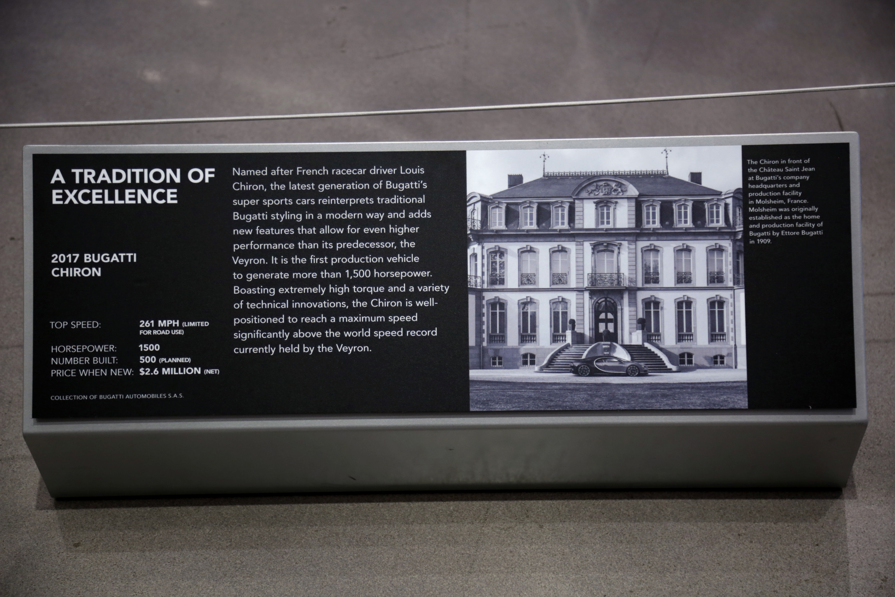 Right now the Bugatti Chiron is the headliner to promote the new Art of Bugatti exhibit at the Petersen Museum. Bugatti’s latest hypercar will be available for your viewing and drooling pleasure until early November, but the rest of the exhibit will be on display all the way through the fall of 2017.