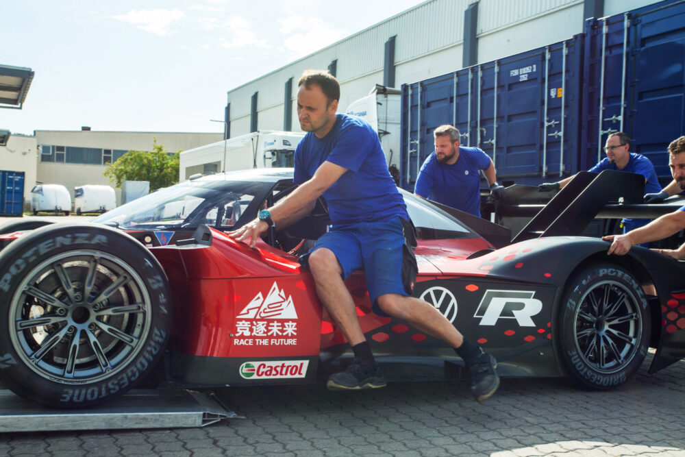 Now, for the ļ¬rst time in over 50 years of Volkswagen motorsport, a race car and any necessary material will primarily be transported to its destination by rail. Two blue 40-foot containers and two 20-foot containers have already boarded a train in Hamburg and set oļ¬ for Chongqing, China. The four containers will only be transported by truck from Hannover to Hamburg and for the ļ¬nal miles to the foot of Tianmen Mountain. Once on site, the team will be completely self-suļ¬cient with the equipment it has transported ā such as with an environmentally-sound, glycerin powered generator, which supplies the entire team with electricity, as well as charging the ID.R.