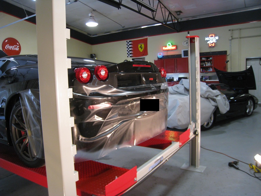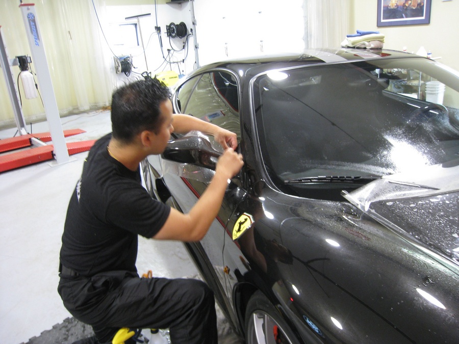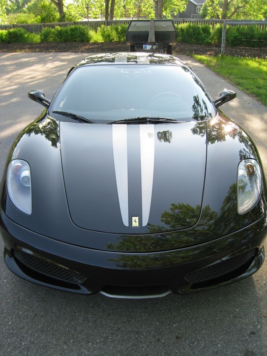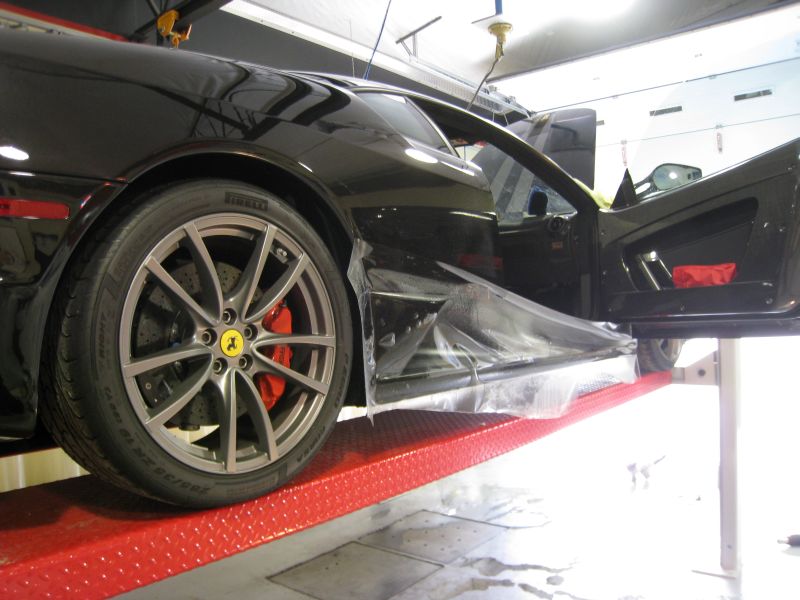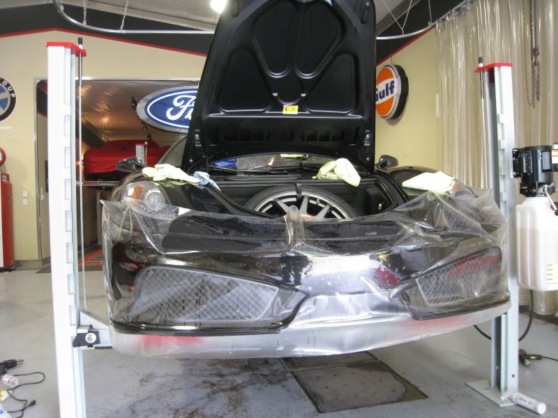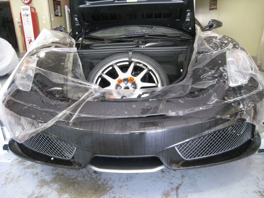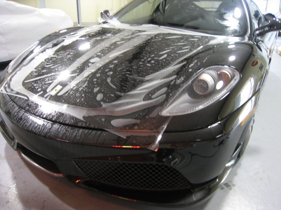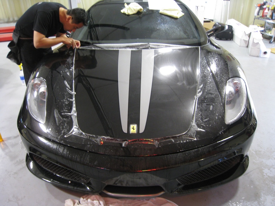 3. custom full front quarter panels - 1 piece application from left to right side of vehicle. The traditional application method is partially up to the headlamps. For some with full quarter applications, it is done in 2 pieces with some edges exposed and a 3.5 inch long seam under the Ferrari emblem on hood. Our application is in one piece