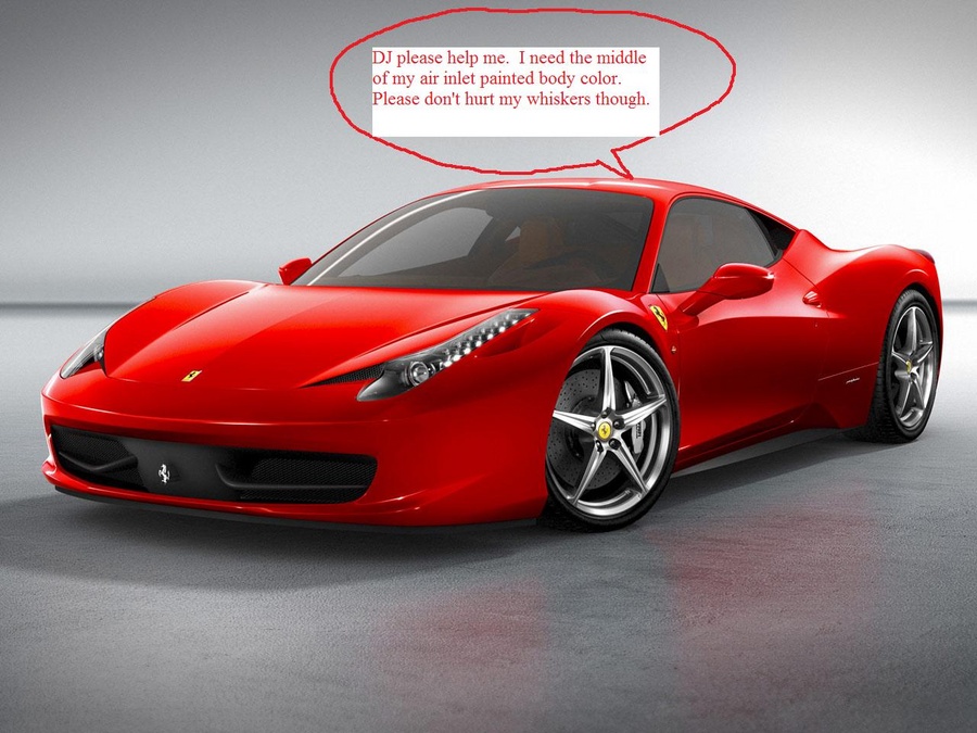 The front end is dominated by the gaping open "mouth". Maybe painting the center section between the two inlets body color would do much to break up the mouth and give the same look as 360/430? It may look best if the air inlet deforming whisker looking things were left black. I think it would make the front end look nicer and its probably the first thing I'd do to a 458.