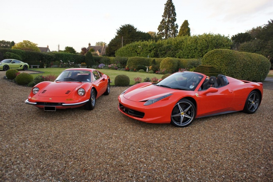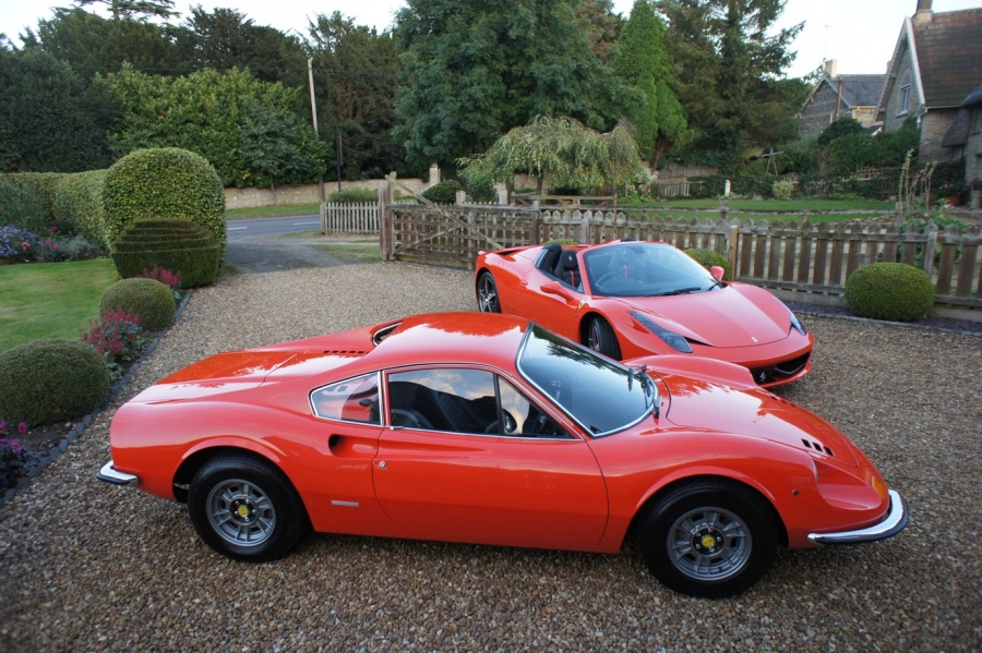 Thought I'd post up a couple of pics of the spider alongside my newly restored 246GT which is also painted in Rosso Dino. Separated by 40 years but some of the design references from the Dino are very apparent in the newer car.