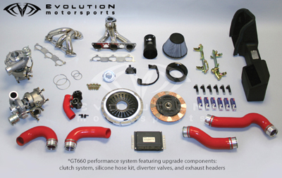 Just an FYI as I took a recent trip out to see our friends at Evolution Motorsports and amongst other things I got to get a good taste of their new GT660 kit. We've always been a fan of the GT700 kits and have been installing them since 2005 but in my mind anything after the Stage II using the K24s just didn't cut it. The K24s aren't really fun to drive with. The 660 kit sits right there as a logical step-up for people with Stage IIs looking for more power. Built-upon similair building blocks to their GT700 kit, EVO's GT660 kit incorporates their newly designed Garrett turbo chargers. The red 996TT (Steve's?) we got a ride in was spot on the 660 hp / 652 tq On Pump Fuel Mode 91/93 Octane after the mustang dyno AWD conversion (I got to see about 30 dynos before my ears gave out). For any cars already with an exhaust and a few other parts this kit works well to incorporate what you already have. The stock fuel system can take a little more than 600 but really starts to max out (wish us 996tt'ers had the 997TT injectors) so having the higher-flow injectors bring the duty cycles back down to where they should be There should be some new announcements from EVO shortly. I got to drive in another car with these afformentioned turbos and again the spool-up is much improved. Let's face it none of us really like those laggy K24s...