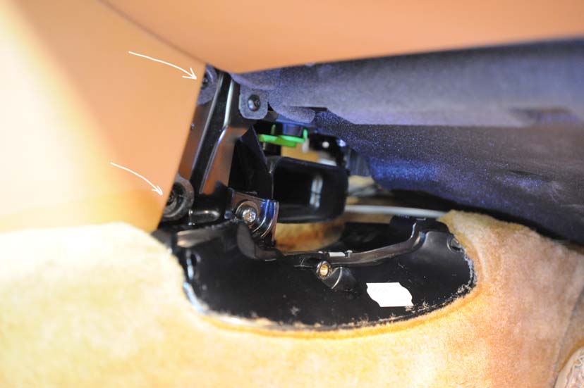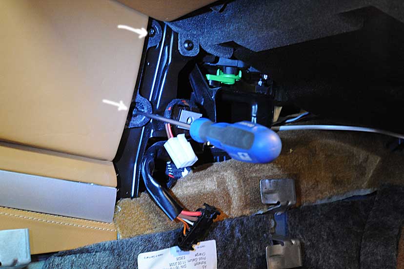 2. Accessing the rear of the PCM requires its removal from the console. You need to first remove the two short carpeted console extension pieces that are aft of the leather-covered console side pieces. These can be removed with one of the Torx screwdrivers. On the left or driver's side you will have to sort of hunt through the carpeting to locate the screwhead. On the passenger side, particularly if you have a cabriolet with the Bose option, you will have to take off the speaker's 'grill' first (physically, and without tools, remove the central plastic piece first to access the Torx screw inside). Once that is removed you can disconnect the 12 VDC plug from the rear. Once these carpeted (left side) or plastic pieces (with the 12 VDC plug) are removed you now have clear access to remove the 2 Torx screws that secure the aft end of the console side pieces. (For the non-cabriolet models hunt around in the carpet directly beneath the 12 VDC plug for the securing screw).