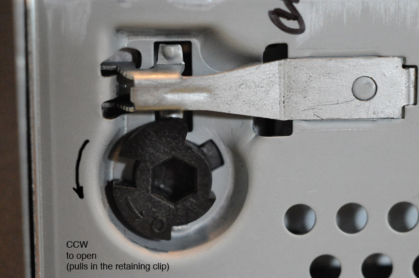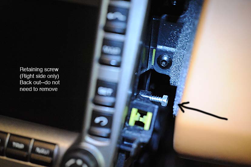 4. The physically hard work is done. Now you have to use the 5mm Allen wrench to retract the 4 clips to the PCM unit that keep it firmly secured to the PCM opening. These things operate like little cams, so you have to very gently rotate them perhaps a 1/4 turn CCW to 'OPEN' them. That results in the little arms being retracted, or compressed against the body of the PCM, now freeing the PCM unit from the console. One more step is required however before you can slide the PCM out,--you need to back out a final security 7mm screw on the passenger side (see image) that locks the PCM from simple removal. With the 7mm box wrench back it out several turns until you think the PCM can be slid forward toward you. Before you remove the PCM put down several layers of a thick towel down across the stick-shift so that the bottom of the PCM unit has something to rest on while you are making the electrical and fiber-optic connections. (Take a close look at the image(s) of the small black plastic cams and the retaining arms to get an idea of what they look like which will, in turn, give you an idea of how they work.)