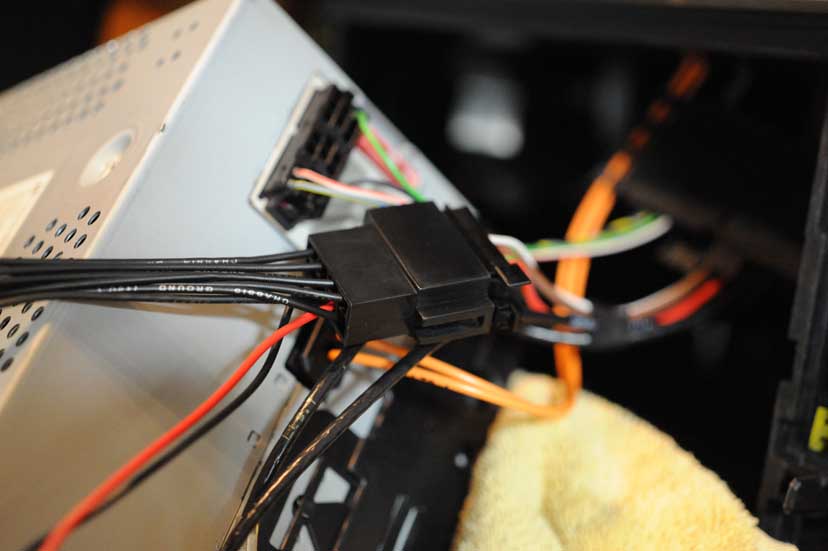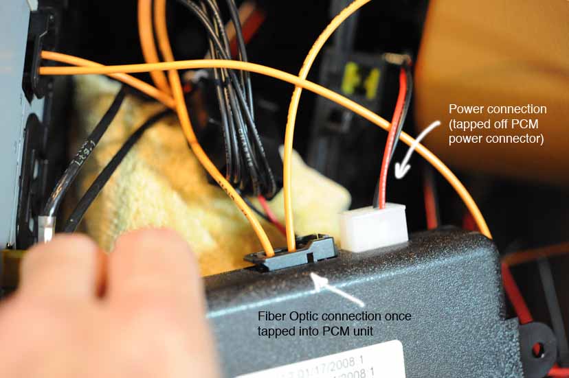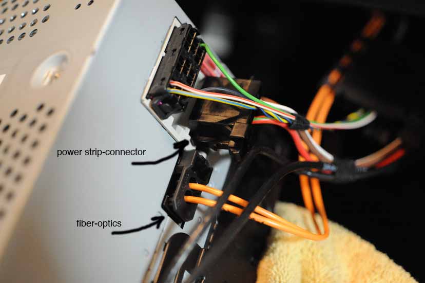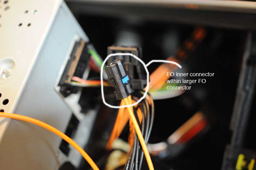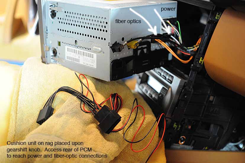 5. With the PCM unit cushioned on the towel over the shift knob, manuever it around to access the rear. I sat in the passenger seat as I did this so I had the rear of the PCM facing the passenger side. Locate the electrical connector on the rear of the PCM, along with the fiber optic lines going to and from the PCM. They are secured in a black plastic connector. With the Tooki wiring harness handy, remove the electrical connector from the back of the PCM and substitute in its place the appropriate Tooki-supplied connector. The other connector on the Tooki-supplied wiring harness needs to be plugged into the source cable,--the one you just removed from the rear of the PCM. Doing all that merely provides you with an additional electrical connector (in white) which you later will plug into the Tooki unit. As with all these connectors, they are polarized and can only go in one way.