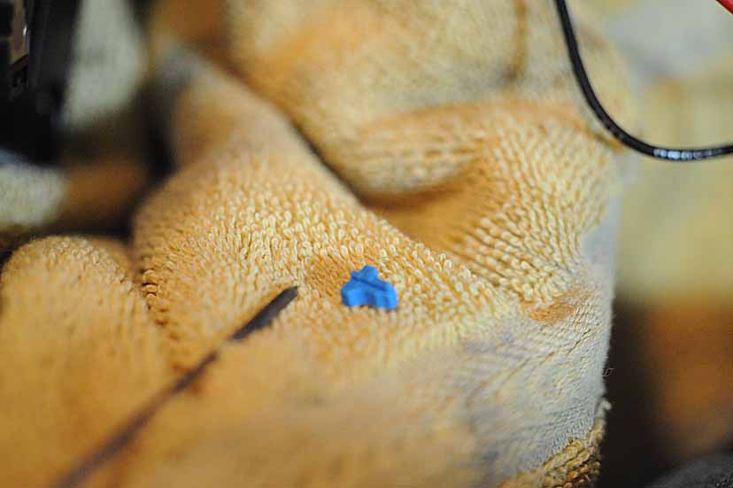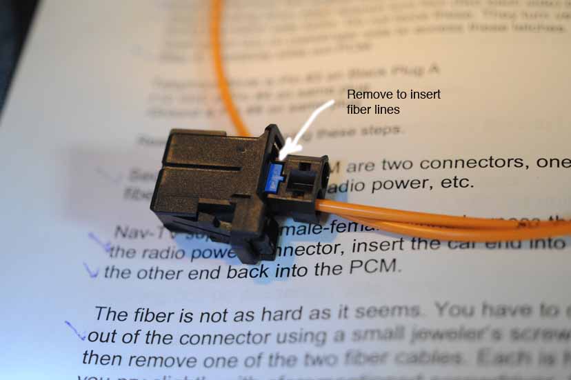 6. The fiber optic connections are next. Ensuring that you have plenty of lighting, remove the fiber optic connector from the back of the PCM unit. Note that one of the orange FO lines is an IN and the other an OUT. (There are small arrows on the connector itself indicating this). Move onto the Tooki's FO connector next to prepare it for receiving the OUT FO line from the PCM. That TOOKI-provided FO connector is actually an assembly. It has to come apart to get inside it to remove its blue tab and prepare it to receive the OUT FO line from the PCM. There is a clasp on one side of that connector that secures the smaller black plastic inner piece which holds the FO lines. With the small jeweler's screwdriver depress that clasp and then you will be able to pull out the inner FO connector. With that out you will see the blue tab that secures the barbed FO line(s) within that inner connector. Once that blue tab is removed you can easily take the OUT side FO line from the PCM FO connector and, disassembling that (removing its blue tab), insert it into that inner connector that will be plugged into the Tooki. Reinstall the blue T tab to keep the FO in position within that inner connector. Now snap that inner connector inside the larger FO connector. The other free FO line from the Tooki connector goes into the PCM's FO connector, essentially tapping into it and providing the FO connectivity to the Tooki.