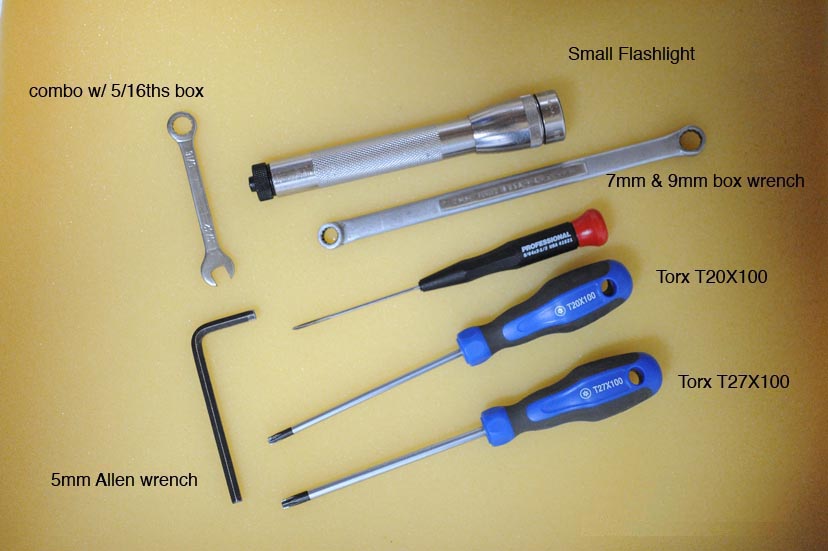 You'll need a small jewelers screwdriver, a couple Torx screwdrivers (specifically, T27X100 and T20X100), a small standard allen wrench (4mm), a box 7mm- 9mm wrench, and a standard 5/16th box wrench. You'll find a small flashlight is also handy.