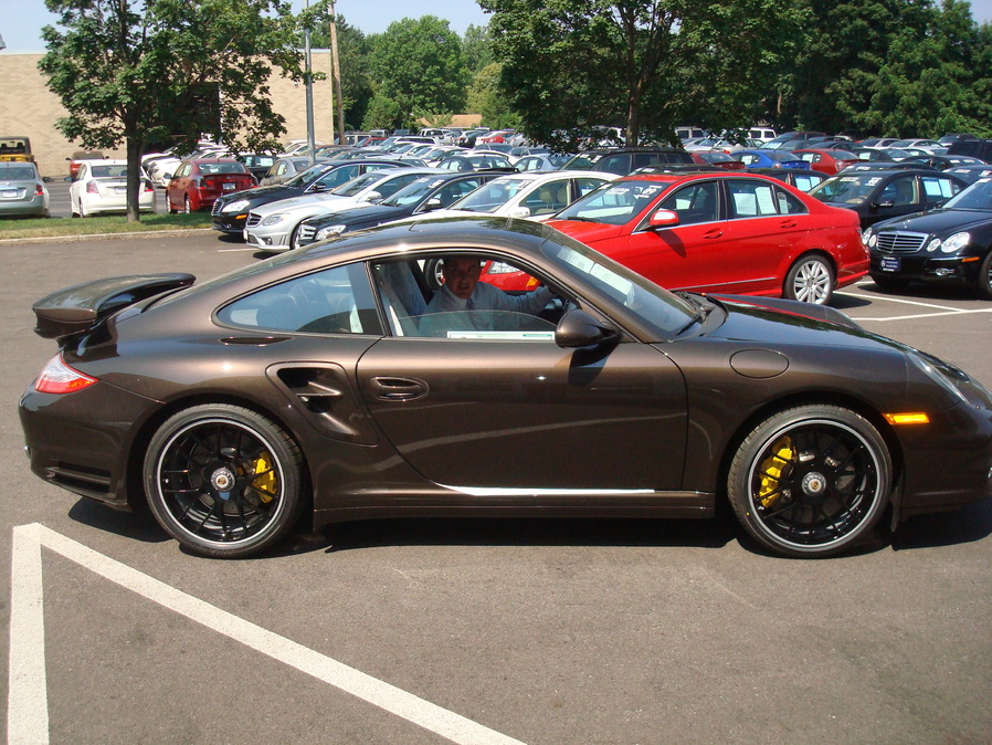 The Turbo S is hot but the colour combination is a no no, the brown is too classy I think it looks best on the cabriolet with beige interior or the natural brown. Honestly I feel the macadamia is very 2008, I think the trend has decreased now. What looks good is the aqua blue, I've seen it on a Carrera S and it looks outstanding.