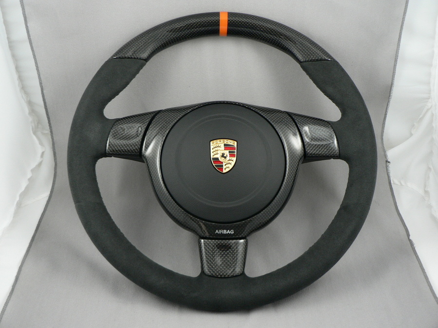 We just did this steering wheel for a local customer's 997 GT3 RS. This is an alcantara GT3 wheel with a carbon top and orange stripe to match the exterior of the RS. We can do the stripe and the stitching in any color. I am really happy with how this wheel and can't wait to see some more variations of it. We just had a customer order one today with a red stripe and red stitching which should turn out really cool.