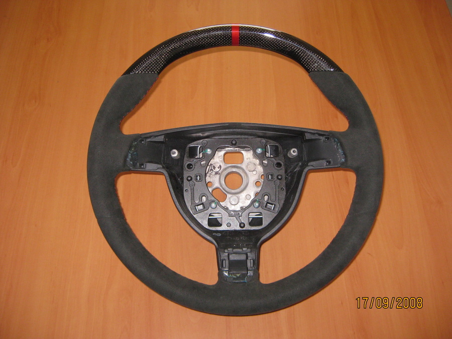 Here is a pic of a new wheel we just got in for a local customer. The first pic is of the wheel with the stock airbag trim ring and trim pieces, and the second pic is of the same wheel with our carbon pieces in the middle.