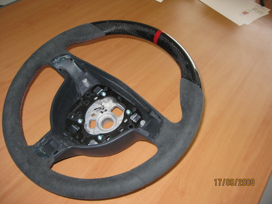 Here is a pic of a new wheel we just got in for a local customer. The first pic is of the wheel with the stock airbag trim ring and trim pieces, and the second pic is of the same wheel with our carbon pieces in the middle.
