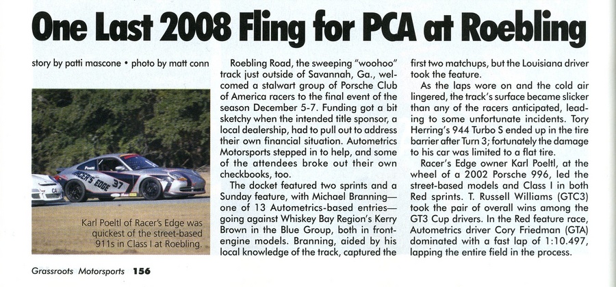 Karl Poeltl, my business partner at European Auto Garage, had his car featured in a photo in Grassroots and mentions his weekend results in December at Roebling Road. Karl beat several 996 Cup Cars with his I stock 996.