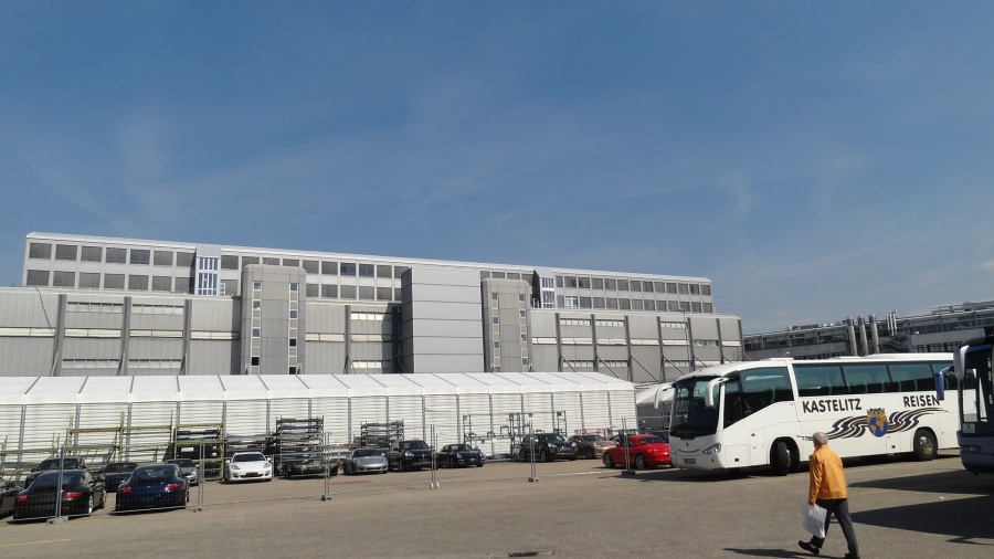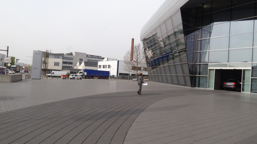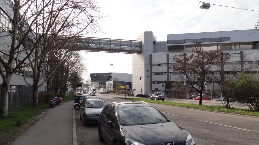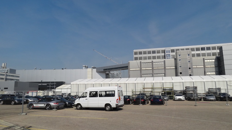 Porsche's paint facility is tucked behind Werk I on Schweiberdinger (photo 1). A series of bridges high overhead transports painted chassis to the assembly plant! (photos 2, 3 & 4). If you look on the other side, behind the Porsche owned dealership called 'Porsche Niederlassung Stuttgart'), you can actually see where theses painted chassis are coming from! The paint facility is way in the back and uses other Porsche buildings as support columns to allow the rolling line of painted chassis to make it all the way to Werk II and the assembly lines! (Photos 5 -10).