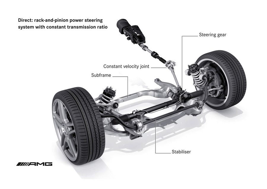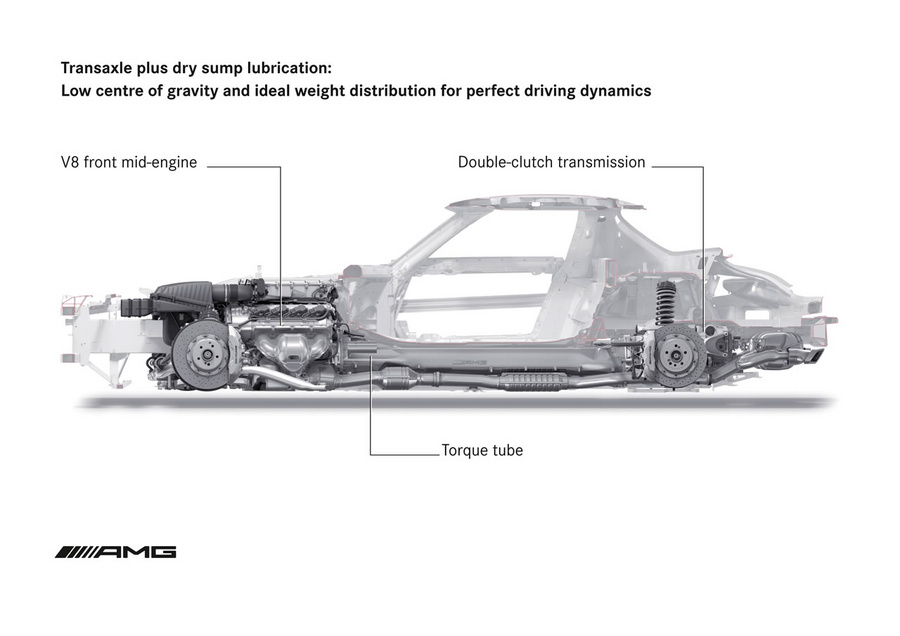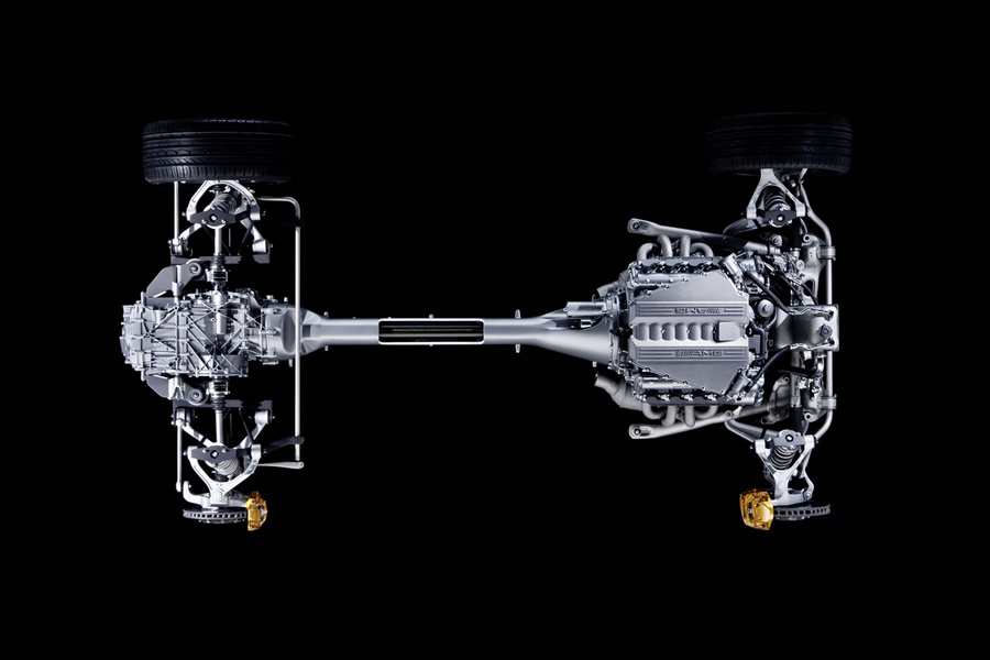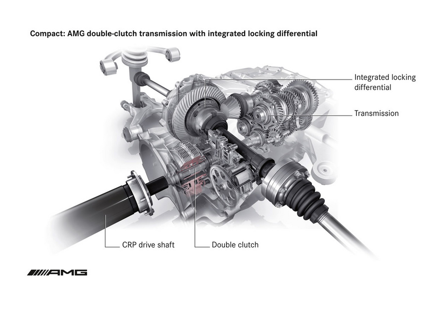 A carbon-fibre shaft rotates at engine speed in the torque tube. The advantages of this sophisticated solution are associated with the rigid link between the engine and transmission and, in turn, the optimum support for the forces and torque generated. A new AMG dual-clutch transmission with seven gears takes care of power transfer. The transmission boasts fast gear changes with no loss of tractive force. The driver has a choice of four different driving modes, ranging from comfortable to extremely sporty, as well as a RACESTART function. Optimum traction comes courtesy of the mechanical differential lock, which is integrated in the compact transmission casing.