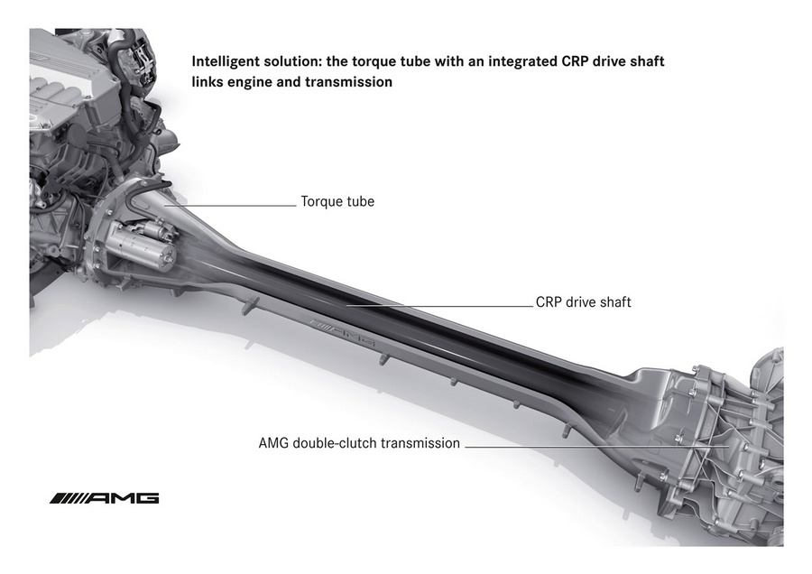 The AMG 6.3-litre V8 engine delivers its abundant power via an ultra-light carbon-fibre driveshaft at the rear axle – similar to the set-up used on the DTM C‑Class racing touring car. The transmission is mounted at the rear (transaxle principle) and is connected to the engine housing via a torque tube.