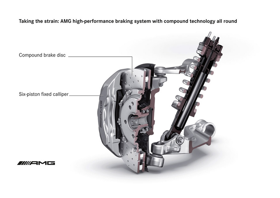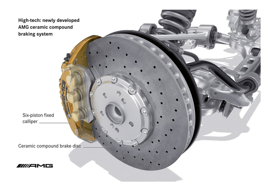 The AMG high-performance composite brakes all-round ensure extremely short stopping distances even under enormous loads. The newly developed, optional ceramic composite brakes with larger brake discs guarantee even better brake performance and lower unsprung masses. The ceramic brake discs will perform reliably at even higher operating temperatures thanks to their greater hardness, all combined with an impressive weight reduction of around 40 percent. Light-weight design was also a key consideration with the wheels: weight-optimised AMG light-alloy wheels – 9.5 x 19 inch (front) and 11.0 x 20 inch (rear) - based on the innovative flow-forming principle reduce the unsprung masses while increasing driving dynamics and suspension comfort. 265/35 R 19 (front) and 295/30 R 20 (rear) tyres developed exclusively for AMG ensure optimum grip.