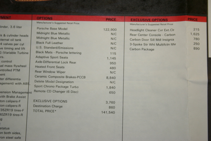 Chris I just got offered a 2007 911 Turbo Artic Silver/Black full leather. I have the sticker its $132,115. 1,200mi I can sell it to you for $105k. You have to act quick though, it will be gone asap. I know you wanted Meteor or Atlas but figured I would run it by you. J
