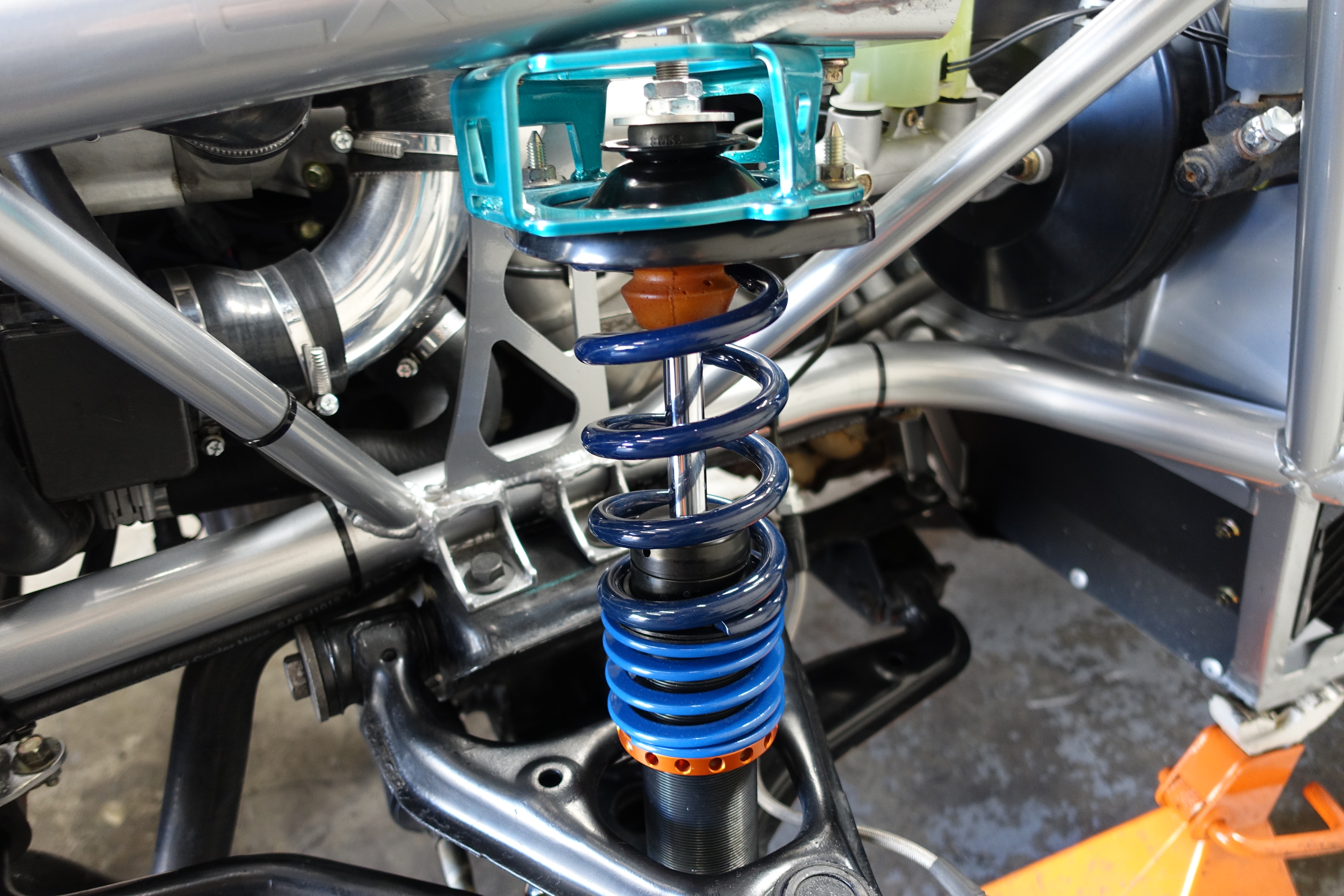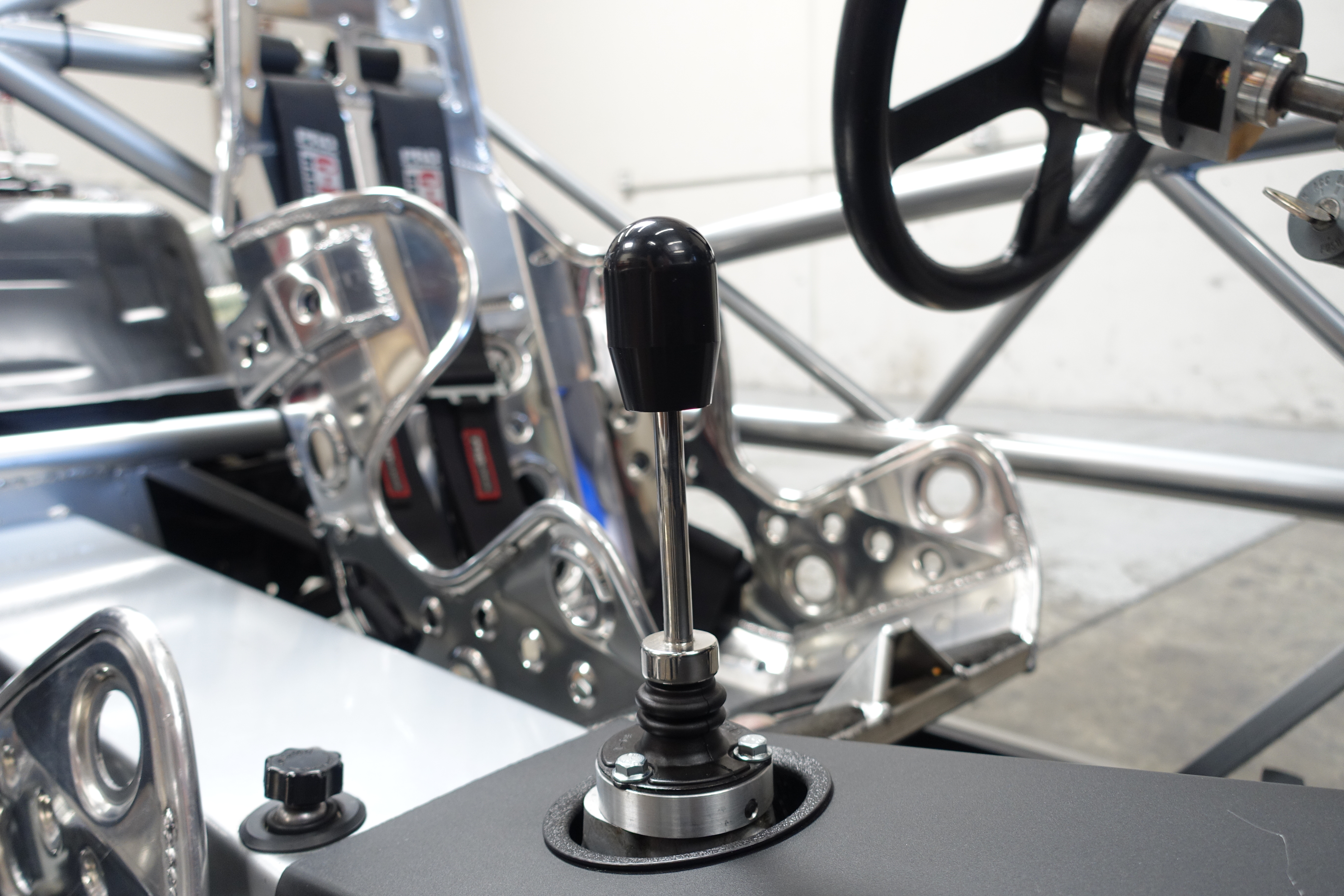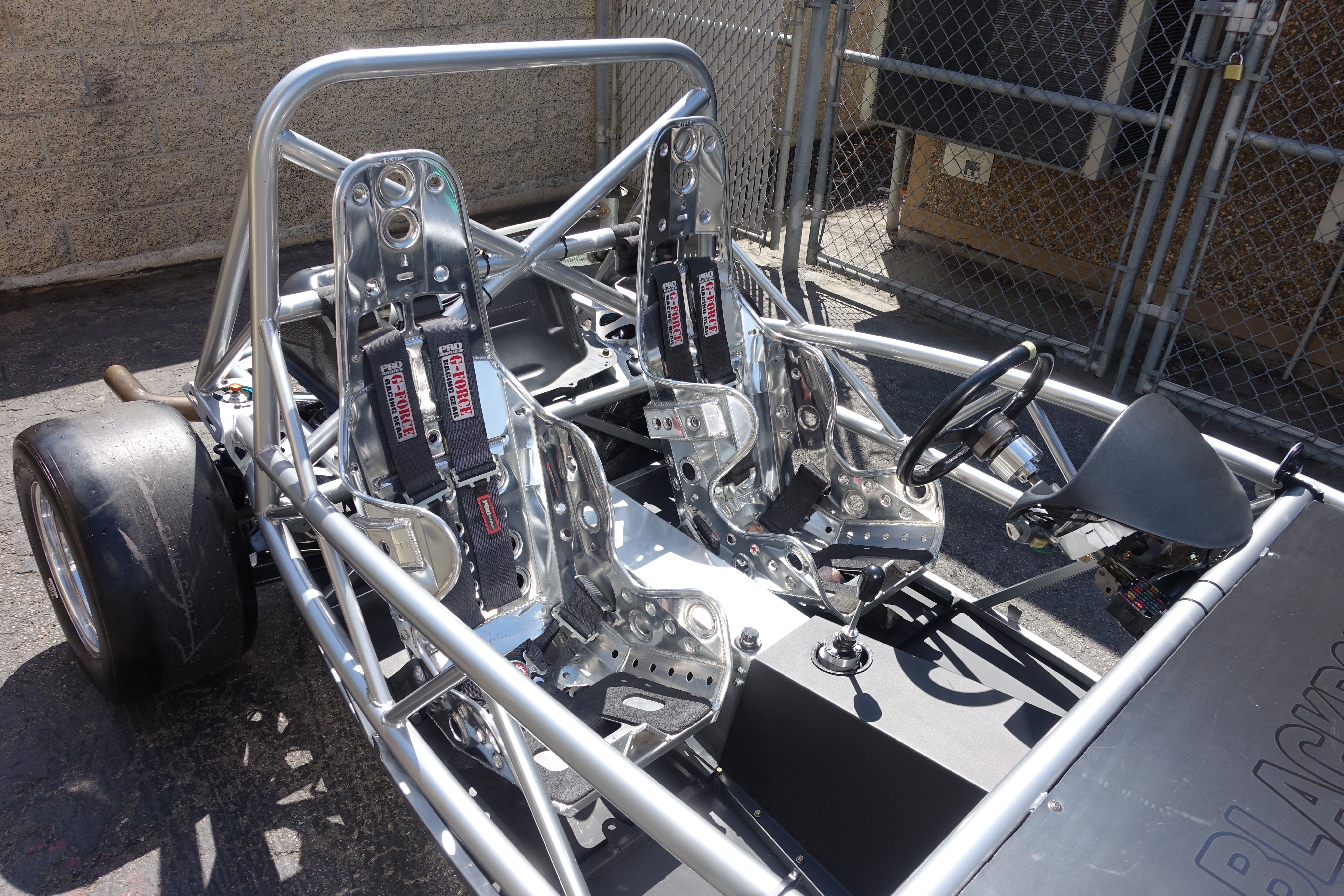 Additional passenger diagonal roll bar bracing - Wing mount kit for CoT wing setup - Domex shock spacer mounts - "80% chrome" chassis coating and "fine textured wrinkle black" aluminum panel finishing from Industrial Powder Coatings - M6 nut-sert fasteners for quick transmission tunnel removal with nickel plated Grade-8 hardware