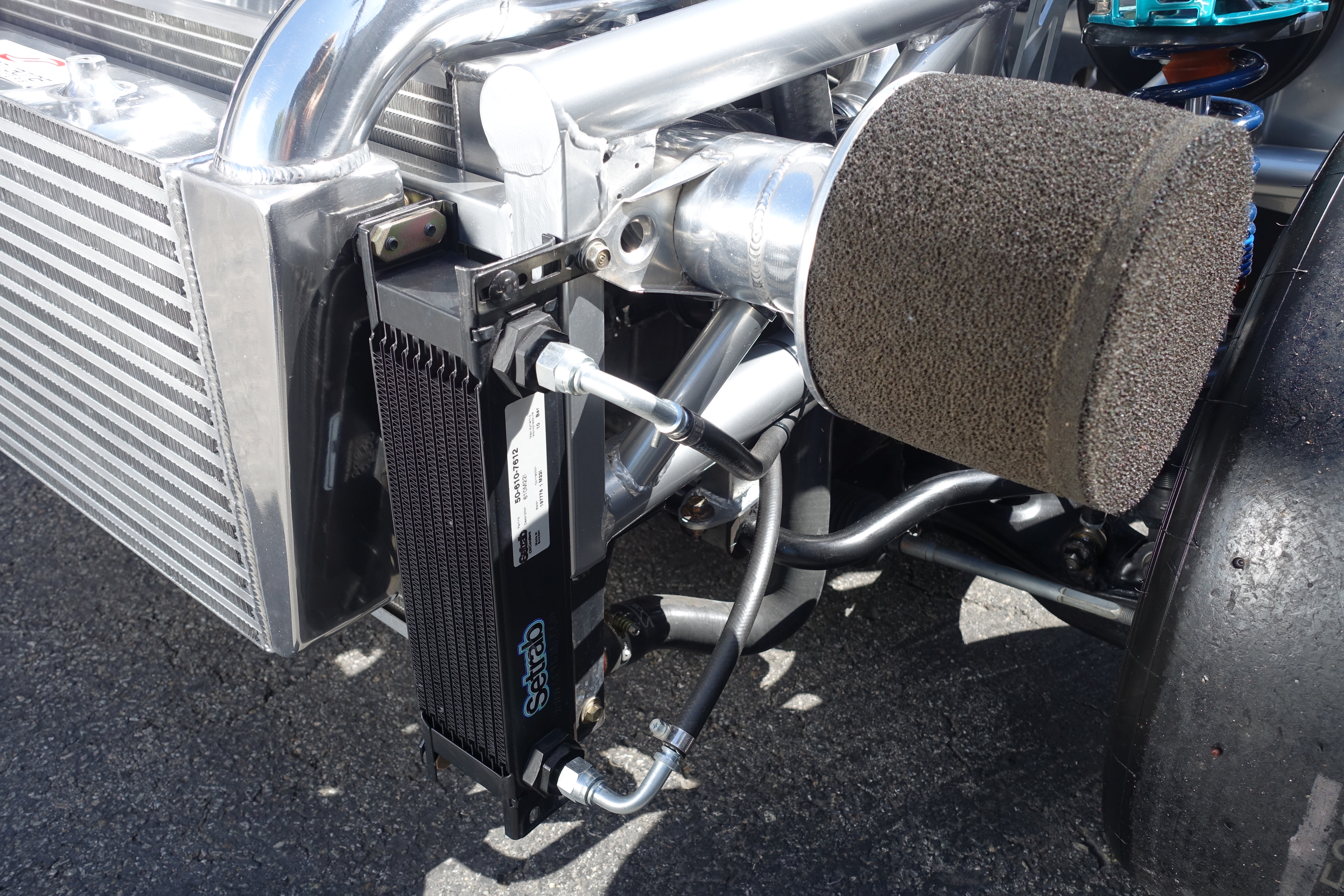 Cooling: Ron Davis cross-flow aluminum radiator - Custom one-piece intercooler setup (minimum charge length and volume, achieving near ambient IAT's) - Setrab 13 row engine oil cooler - Setrab 10 row supercharger traction fluid cooler - Mocal thermostatic oil sandwich plate - XRP 120° -10 AN fittings (x2) - XRP 90° -10 AN fittings (x2) - Aeroquip -10 AN - M22 adapters (x4) - Aeroquip AQP socketless oil hose - Moroso coolant overflow tank - Moroso oil catch can/breather tank with -6 AN line - HPS coolant hoses - Stant Racing high pressure radiator cap - Jackson Racing 160° low-temp thermostat - Oetiker stepless self-tensioning coolant hose clamps (x8) - Norma intercooler coupler clamps - Thermo-tec Multi-layer heat barrier transmission tunnel insulation (cool to the touch even after a full-tilt track session)