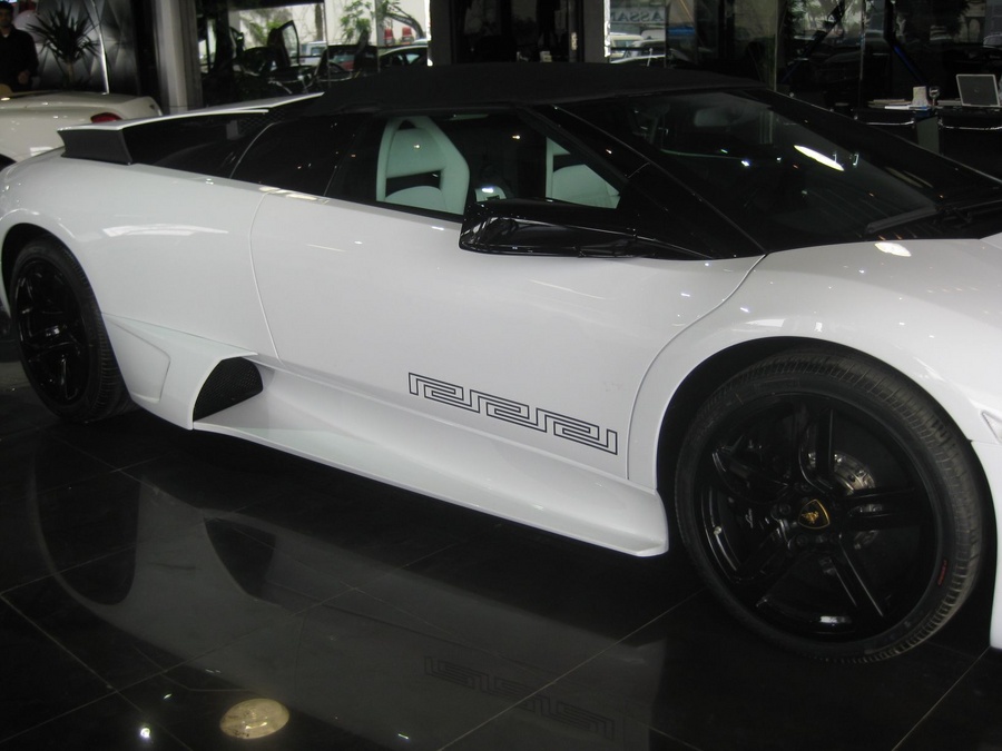 The new limited edition Lamborghini Murciélago LP 640 Roadster VERSACE, which will be produced to order, displays a pastel white livery and the Versace Greek key motif on the lower part of the door. Equipped for the very first time with a transparent engine hood that reveals the powerful V12 engine, this model has been reconfigured internally. The cradle seats are clad in black and white leather, while opulent full grain soft nappa leather – hand-embroidered with the Versace Greek fret motif - upholsters the instrument panel, the doors and the central console.