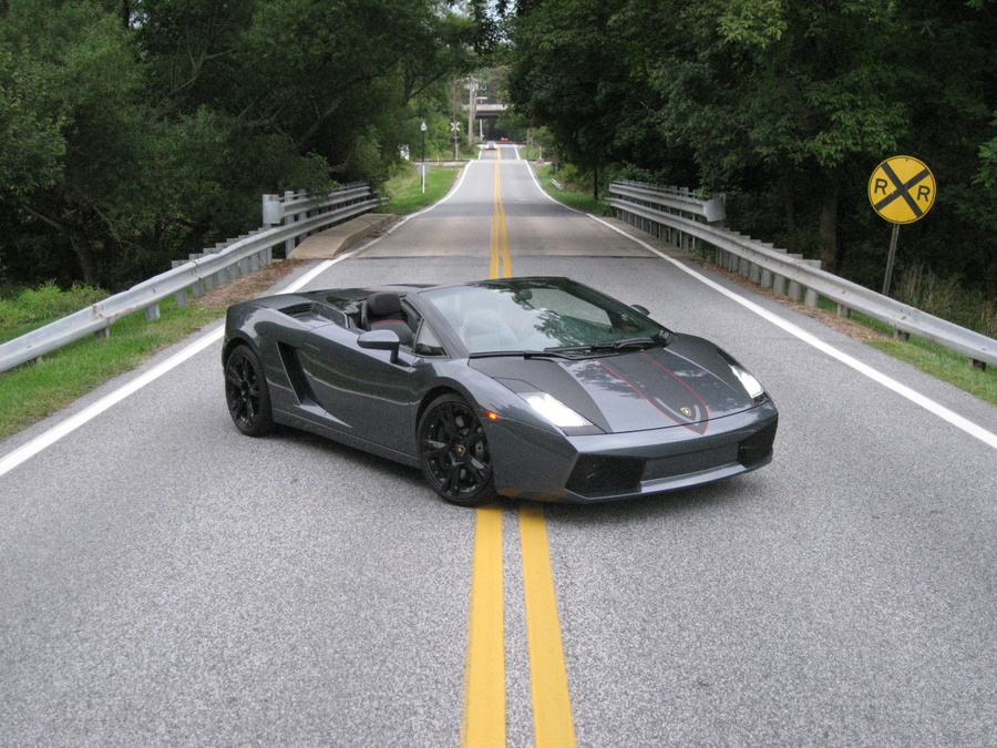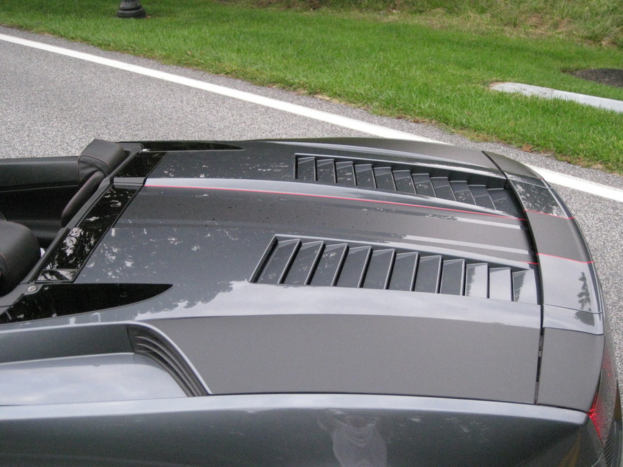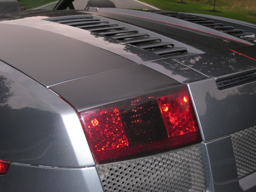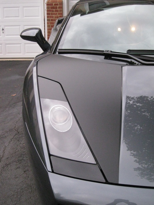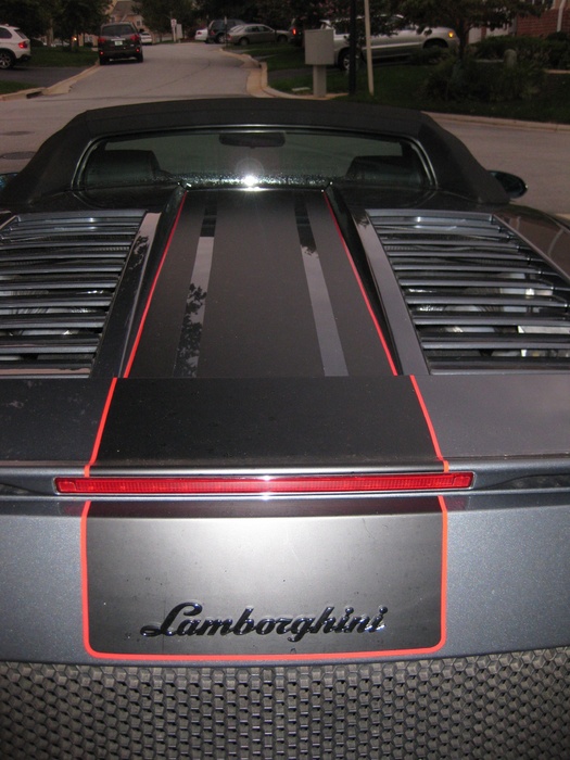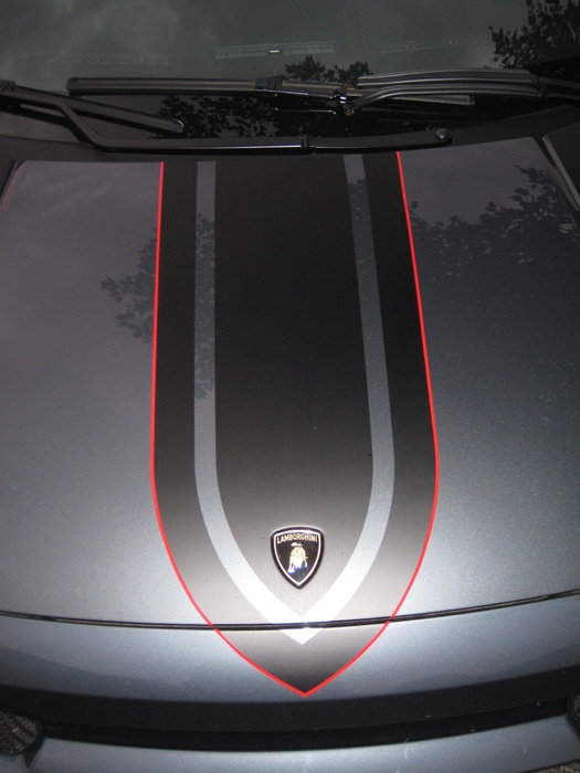 The car is Grigio Proteus on Nero w/Red stitching so we wanted to tie the exterior stripes with the interior somehow. This is what we came up with. It looks hot in person, these pics make it look a little cheap but it really is beautiful up close. We did the flat tape like the Nero Edition first and did the top of the taillight also so it looks a little more like a 560 and took some tape and chopped the headlight. We tinted the taillights, front marker's, and rear markers & painted the Lamborghini badge gloss black. We also painted the Callisto wheels gloss black. The center stripe is flat also and contours to a point along with the front Lambo shield. It is getting the LP560 front bumper now.