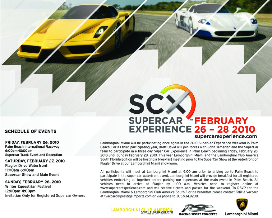 Vehicles need to register online at The Supercar Experience and will receive tickets and passes for the weekend. This event will be covered in La Vita Lamborghini Magazine including the LCA Breakfast at Lamborghini Miami. To RSVP for the Lamborghini Miami & Lamborghini Club America South Florida breakfast please contact Felicia Vaccaro at fvaccaro@prestigeimports.com or via phone to 305.934.9200. RSVP by February 24, 2010.