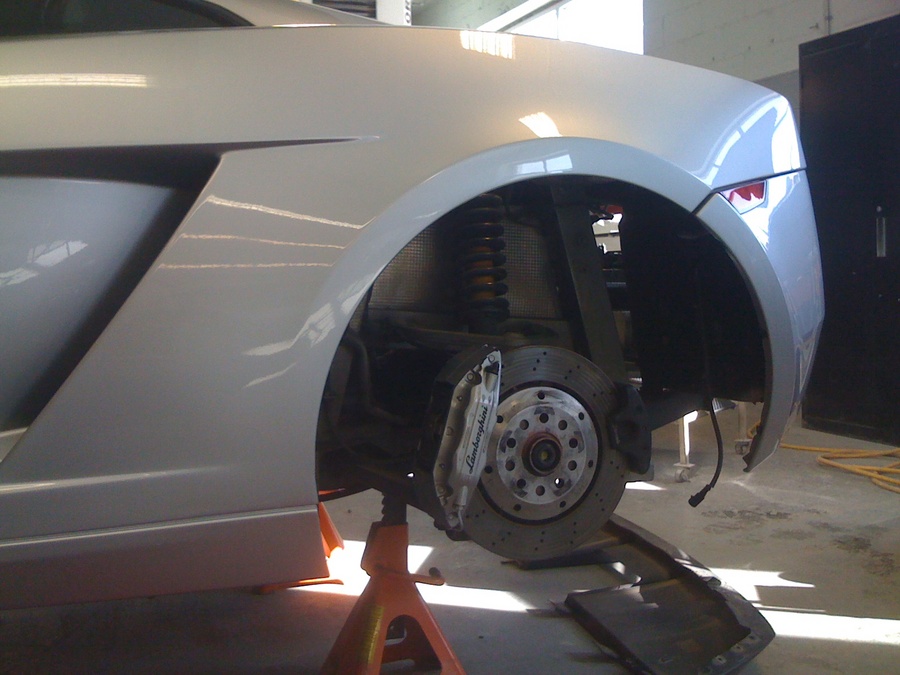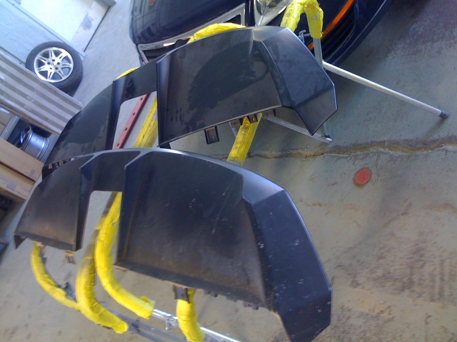The old diffuser and wheel wells were in a trash heap. The old bumper was hanging on a rack along with the new inner bumper support. The new fender was also still on a rack unpainted and unprimed.