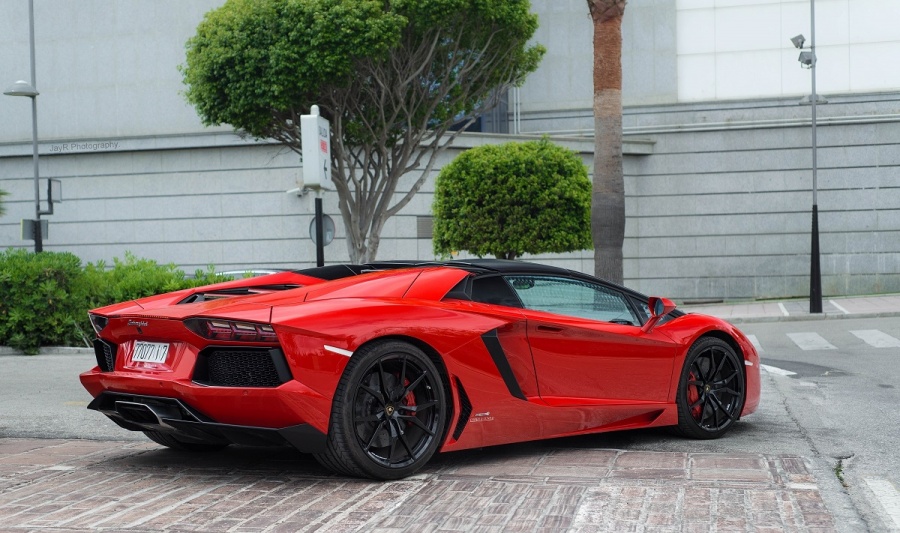 A red Aventador Roadster in Puerto Banus.