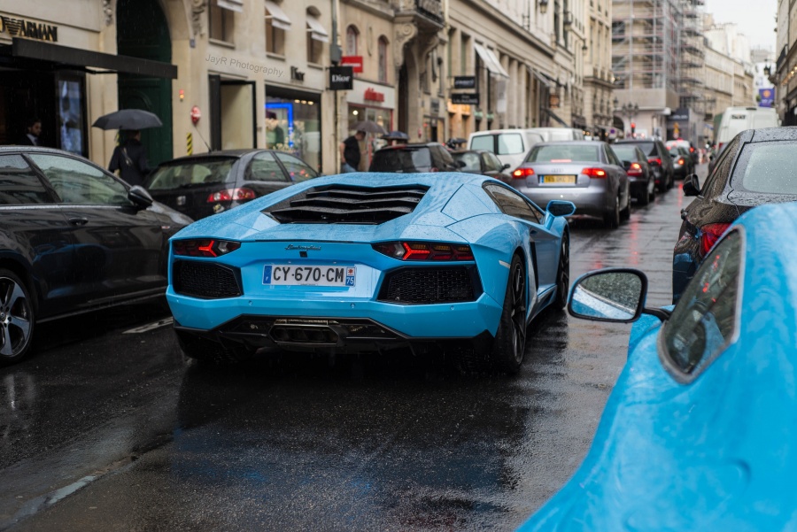 The resident baby blue Aventador of Paris passes by a V12 Vantage, in a somewhat similar colour.