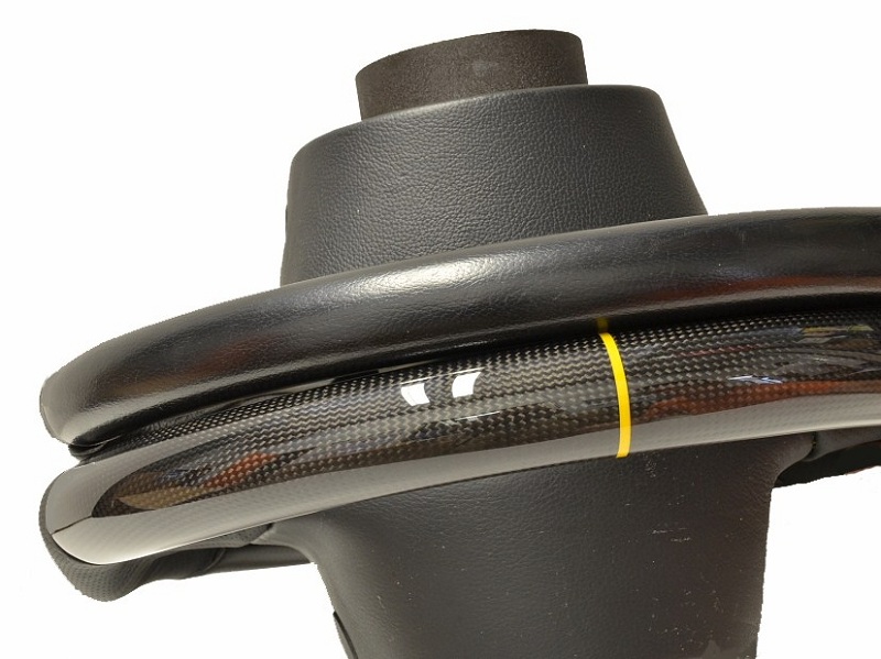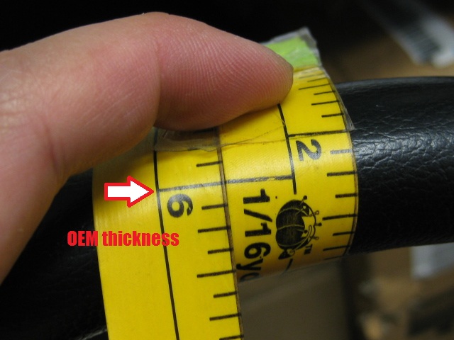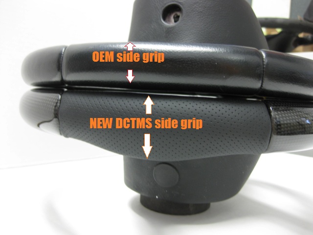 Overall circumference has been increased by 3/4", the new steering wheel is now easier to hold due to the thickness. Of course, the carbon sections, color ring on top and color stitching make the steering wheel look much better than OEM.