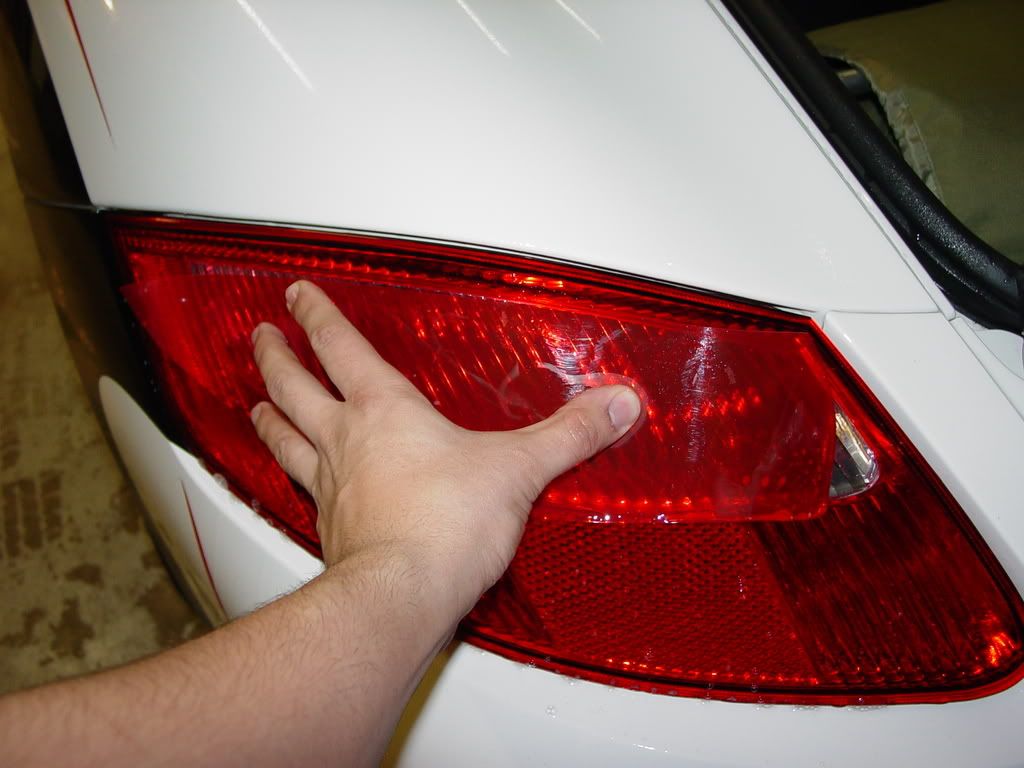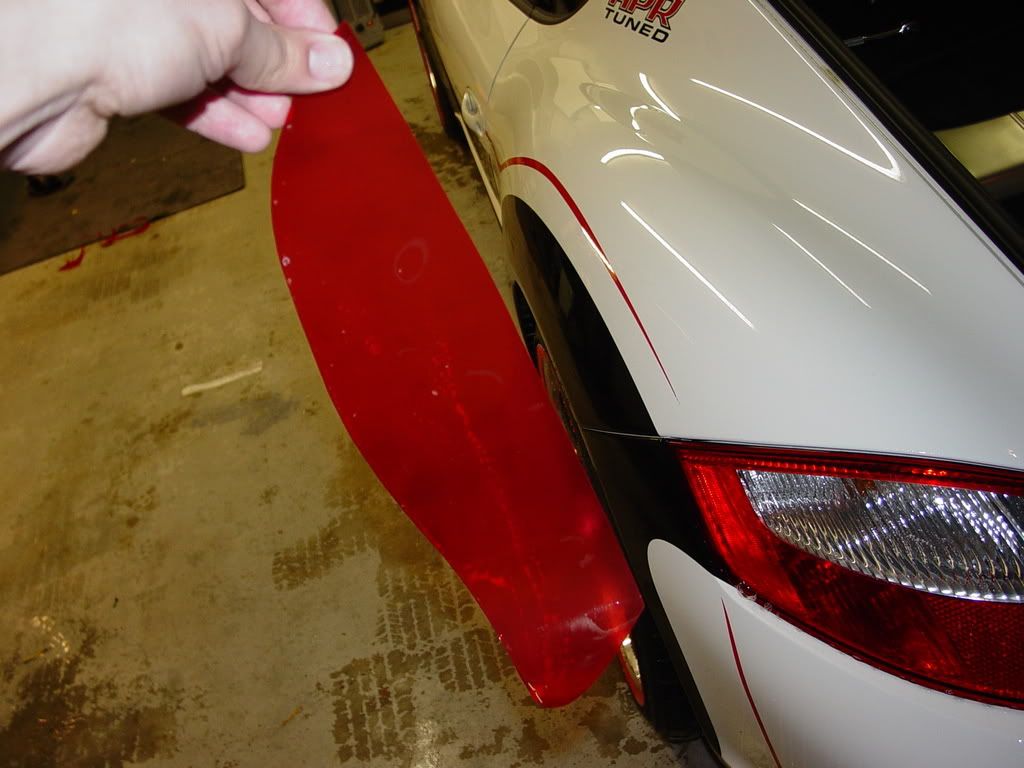 Peel the film from the protective paper and spray generously with solution. Also spray the tailight.
