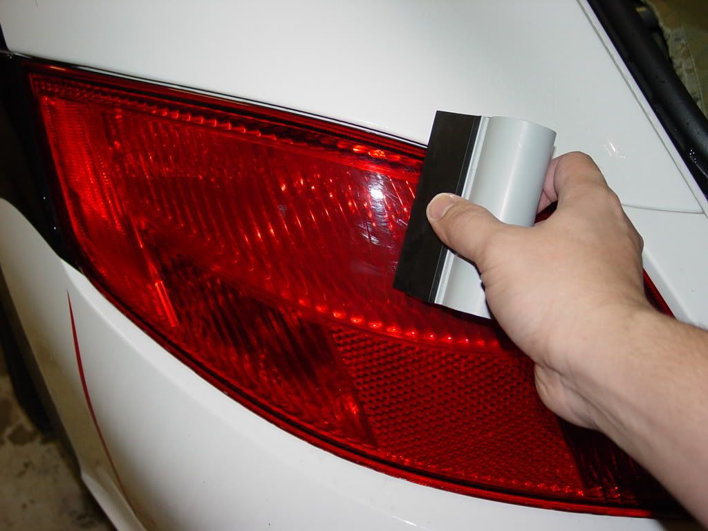 Place it on the headlight, it will look like its too big and will never fit, this is where you need some patience. Hold one side down while you use the squeegie to push out the water. This will look impossible because it will probably slide around alot.