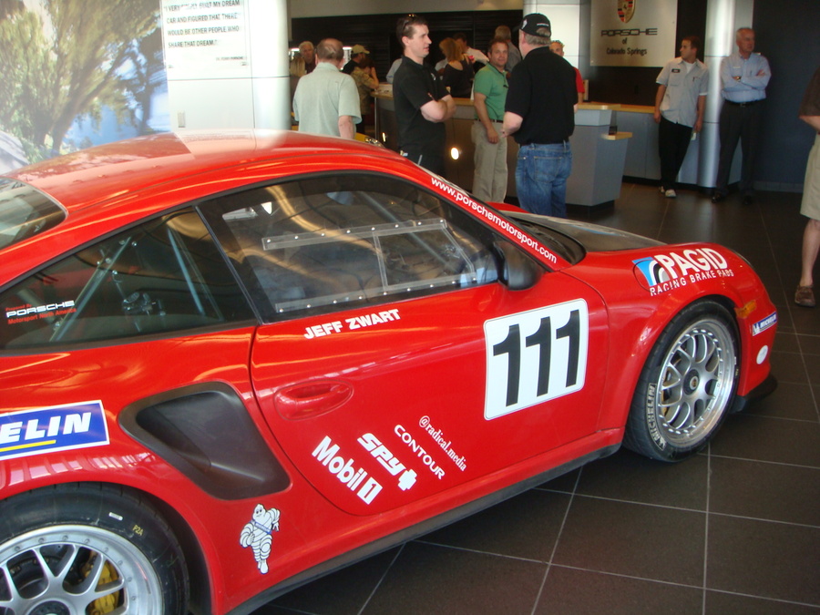I just came back tonight from a reception held at Porsche of Colorado Springs for Jeff Zwart and his gt2 RS in anticipation of his run at Pikes Peak this weekend. I got there early since I know the new General Manager of the dealership Joe Brenner and he showed me around this almost brand new dealership (in business only 5 years). Jeff was in the back still working on his car, along with a group of techs from Porsche Motorsport and Dieter Izenhofer of Andial. I know Jeff since he is a fellow member of R Gruppe. I told him I was expecting soon my '12 Spyder which is scheduled for production in late July. He mentioned that he knows several gt3 RS owners that think their Spyders are even more 'fun' than their gt3's!