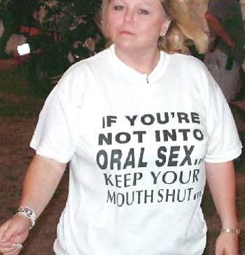 Haha! Jag tänkte faktiskt på det när jag såg den i The Funny Thread. Den där borde vi skicka in till Se och Hör eller nåt och säga att hon springer omrking med olämpliga t-shirts på sig!