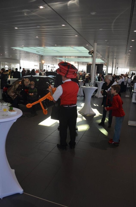 Sen kan jag även nämna att tyskarna är ett rätt speciellt folk. Jag hade förstått att de skulle snacka lite om de nya modellerna och bjuda på dricka och käk, men inte att det skulle bli så mycket mer. Det är ju bara en utställning av bilar liksom. Men jodå, tyskarna drog igång ett liveband med jazz/klassiskt, hade en kille som ritade karikatyrer av folk, en trollkonstnär som gick och trollade bort bilnycklar, en verkstadskille som körde runt med pantominer på en vagn och ställde ut samt en kille som gjorde ballongdjur åt barn! Det kan ändå bara vara i Tyskland tänker jag