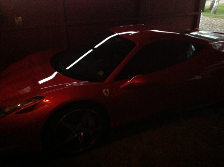 Efter denna bilden så ska jag hålla käften, jag lovar! Bild på 458. Är på föräldrarnas sommarstället och vädret är minst sagt kass och jag blåser iväg bara jag öppnar dörren! Så jag kan ta lite mer bilder imorgon. Den är vinröd i en speciell 3-lagerslack med svart alcantara inredning med vita sömmar. Full karbon och röda bälten i alla fall!