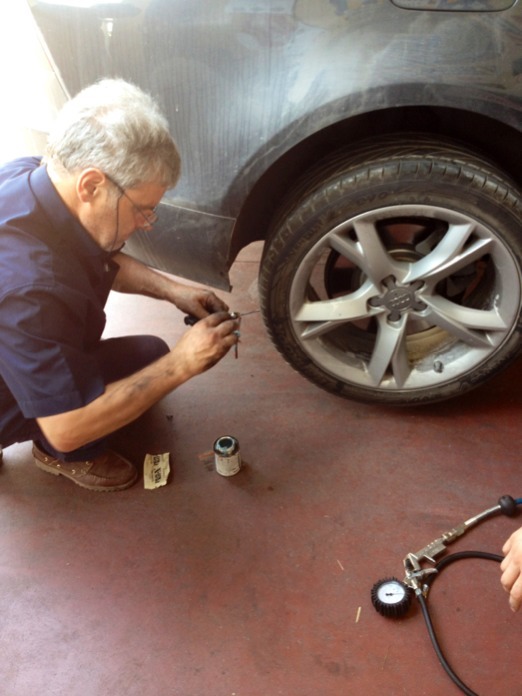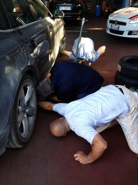 Min bild av italienare blev aningen positivare idag; ett av bakdäcken på bilen har gett ifrån sig ett konstigt ljud och när vi inspekterade det lite närmare såg vi vad som såg ut som en ganska stor skruv som borrat sig in. Åkte in till ett ställe som såg ut som en mack men killen där kunde inte fixa däck. Han erbjöd sig dock att köra före och leda oss till en däckverkstad. Väl där skruvar en riktig mekarsnubbe ut skruven och däcket börjar pysa. Han är dock snabb och har snart tätat hålet. 10€ kändes överkomligt. Några bilder nedan