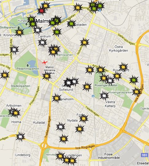 Kolla på den här bilden som är en sammanställning av alla skottlossningar i Malmö i år. Har satt ett litet rött kryss där jag är. Skönt att man e mitt i skiten