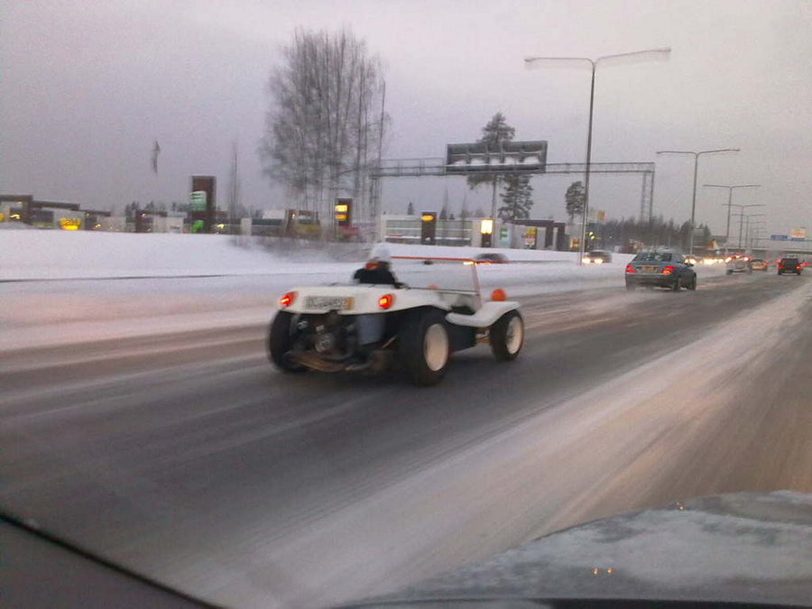 Fronten hängde och en buckla stor som en ladugårdsdörr mitt på huven på hans bil. Ouch. "Ursäkta", frågar han mig en liten stund senare. "Kan du dra loss mig i dragkroken?". "Nej, jag vill inte bli påkörd, men jag hjälper att putta ut dig framifrån." "Äsch, du blir inte påkörd." "Jo, det blir jag." Tolv sekunder senare, Toyota Avensis, BONK! i hans bakstötfångare. Jag sa inte "Jag sa ju det", men var jävligt nära . . .